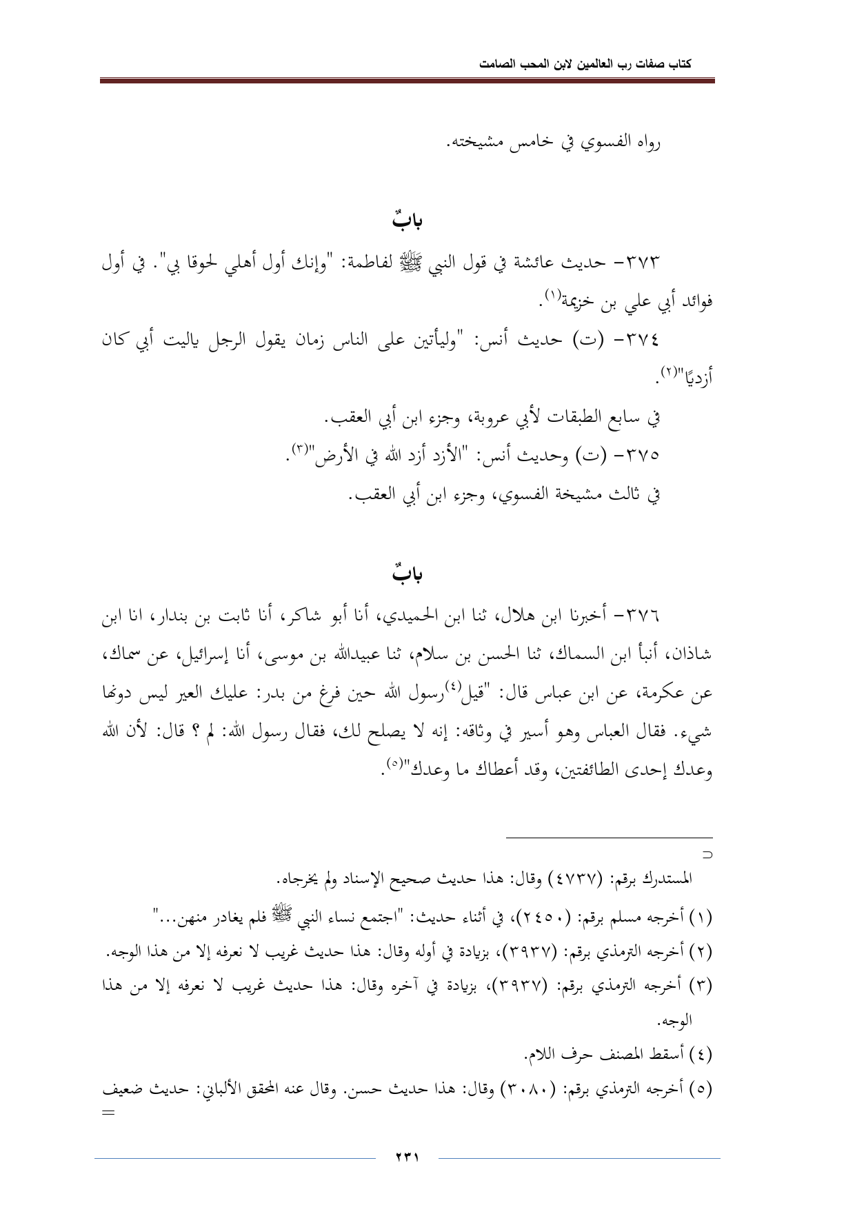 ٣٧٣ - حديث عائشة في قول النبي -صلى الله عليه وسلم- لفاطمة: "وإنك أول أهلي لحوقا بي". في أول فوائد أبي علي بن خريمة (¬١).