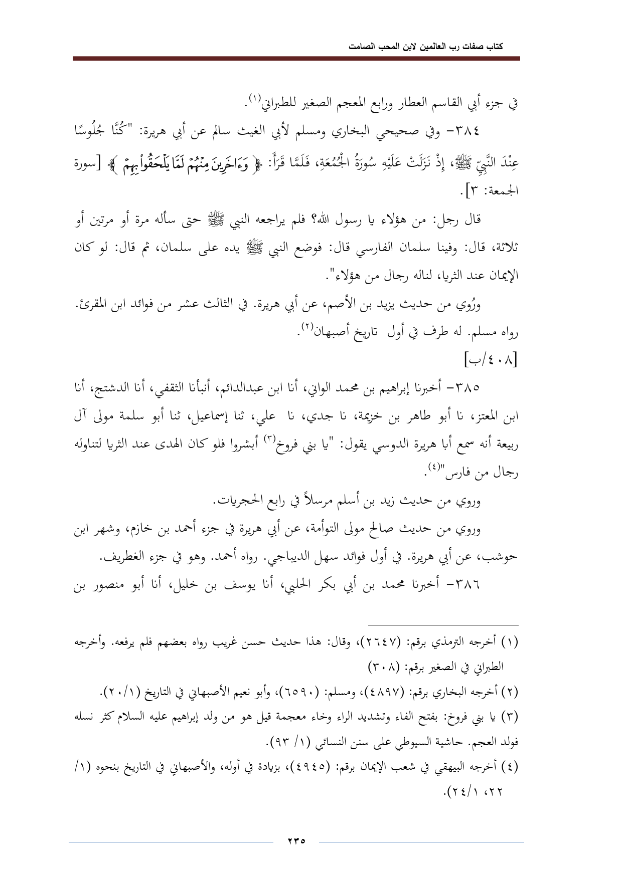 ٣٨٤ - وفي صحيحي البخاري ومسلم لأبي الغيث سالم عن أبي هريرة: "كنَّا جُلُوسًا عِنْدَ النَّبيّ -صلى الله عليه وسلم-، إِذْ نَزَلَتْ عَلَيْهِ سُورَةُ الجمُعَةِ، فَلَمَّاقَرَأَ: {وَآخَرِينَ مِنْهُمْ لَمَّا يَلْحَقُوا بِهِمْ} [سورة الجمعة: ٣].
