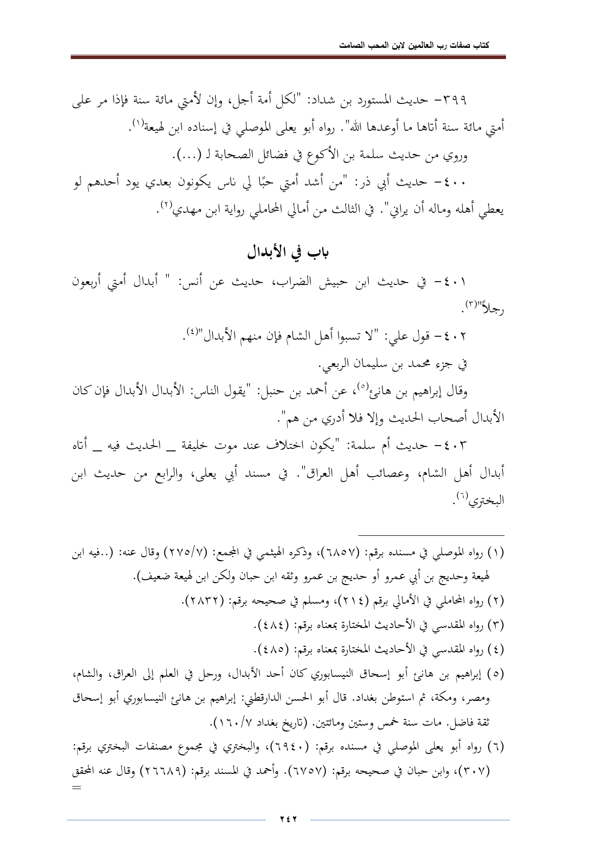 ٤٠٠ - حديث أبي ذر: "من أشد أمتي حبًا لي ناس يكونون بعدي يود أحدهم لو يعطي أهله وماله أن يراني". في الثالث من أمالي المحاملي رواية ابن مهدي (¬٢).