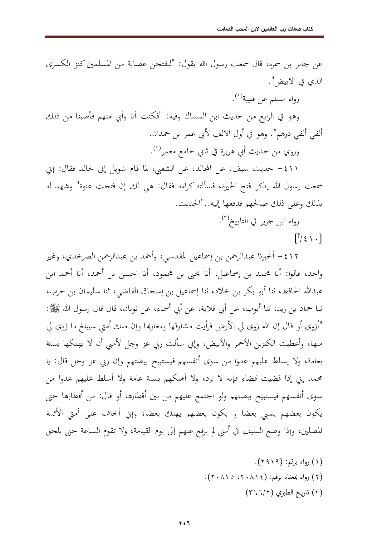 ٤١٢ - أخبرنا عبد الرحمن بن إسماعيل المقدسي، وأحمد بن عبد الرحمن الصرخدي، وغير واحد، قالوا: أنا محمد بن إسماعيل، أنا ير بن محمود، أنا الحسن بن أحمد، أنا أحمد ابن عبد الله الحافظ، ثنا أبو بكر بن خلاد، ثنا إسماعيل بن إسحاق الماضي، ثنا سليمان بن حرب، ثنا حماد بن زيد، ثنا أيوب، عن أبي قلابة، عن أبي أسماء، عن ثوبان، قال قال رسول الله -صلى الله عليه وسلم-: "أزوى أو قال إن الله زوى لي الأرض فرأيت مشارقها ومغاربها وإن ملك أمتي سيبلغ ما زوى لي منها، وأعطيت الكنزين الأحمر والأبيض، وإني سألت ربي عز وجل لأمتي أن لا يهلكها بسنة بعامة، ولا يسلط عليهم عدوا من سوى أنفسهم فيستبيح بيضتهم وإن ربي عز وجل قال: يا محمد إني إذا قضيت قضاء فإنه لا يرد، ولا أهلكهم بسنة عامة ولا أسلط عليهم عدوا من سوى أنفسهم فيستبيح بيضتهم ولو اجتمع عليهم من بين أقطارها أو قال: من أقطارها حتى يكون بعضهم يسي بعضا وبكون بعضهم يهلك بعضا، وإني أخاف على أمتي الأئمة المضلين، وإذا وضع السيف في أمتي لم يرفع عنهم إلى يوم القيامة، ولا تقوم الساعة حتى يلحق