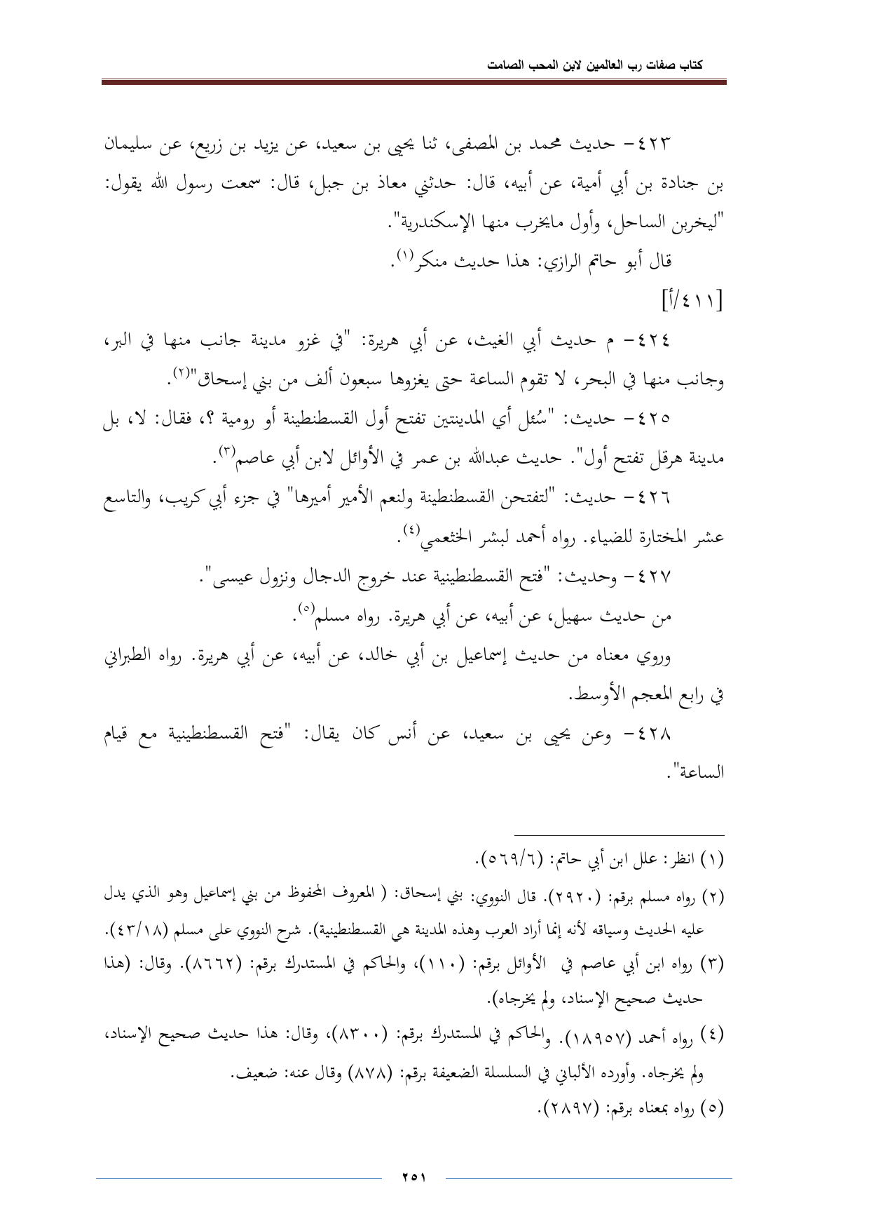 ٤٢٥ - حديث: "سُئل أي المدينتين تفتح أول القسطنطينة أو رومية؟، فقال: لا، بل مدينة هرقل تفتح أول". حديث عبد اللّه بن عمر في الأوائل لابن أبي عاصم (¬٣).