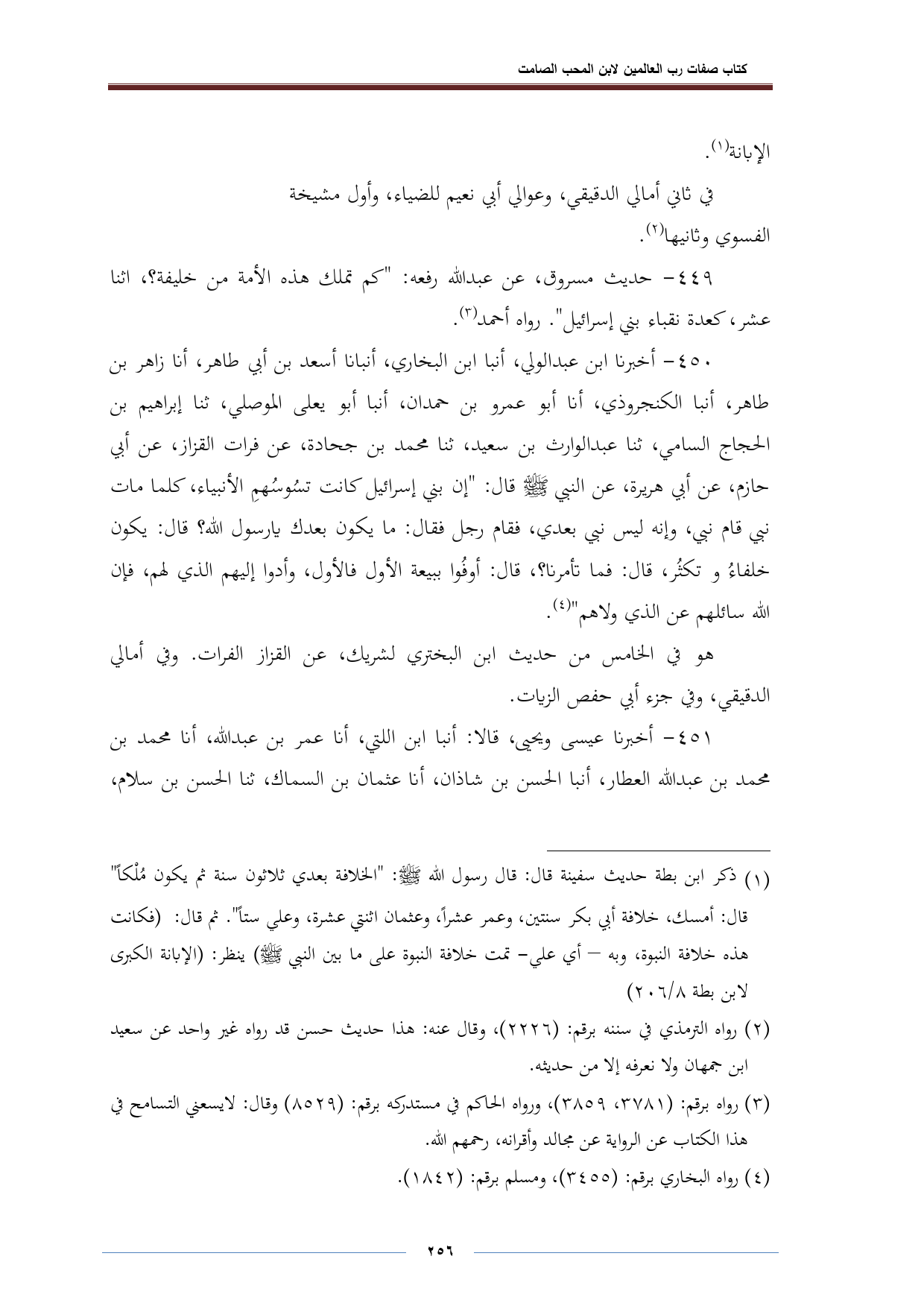 ٤٤٩ - حديث مسروق، عن عبد اللّه رفعه: "كم تملك هذه الأمة من خليفة؟، اثنا عشر، كعدة نقباء بني إسرائيل. رواه أحمد (¬٣).