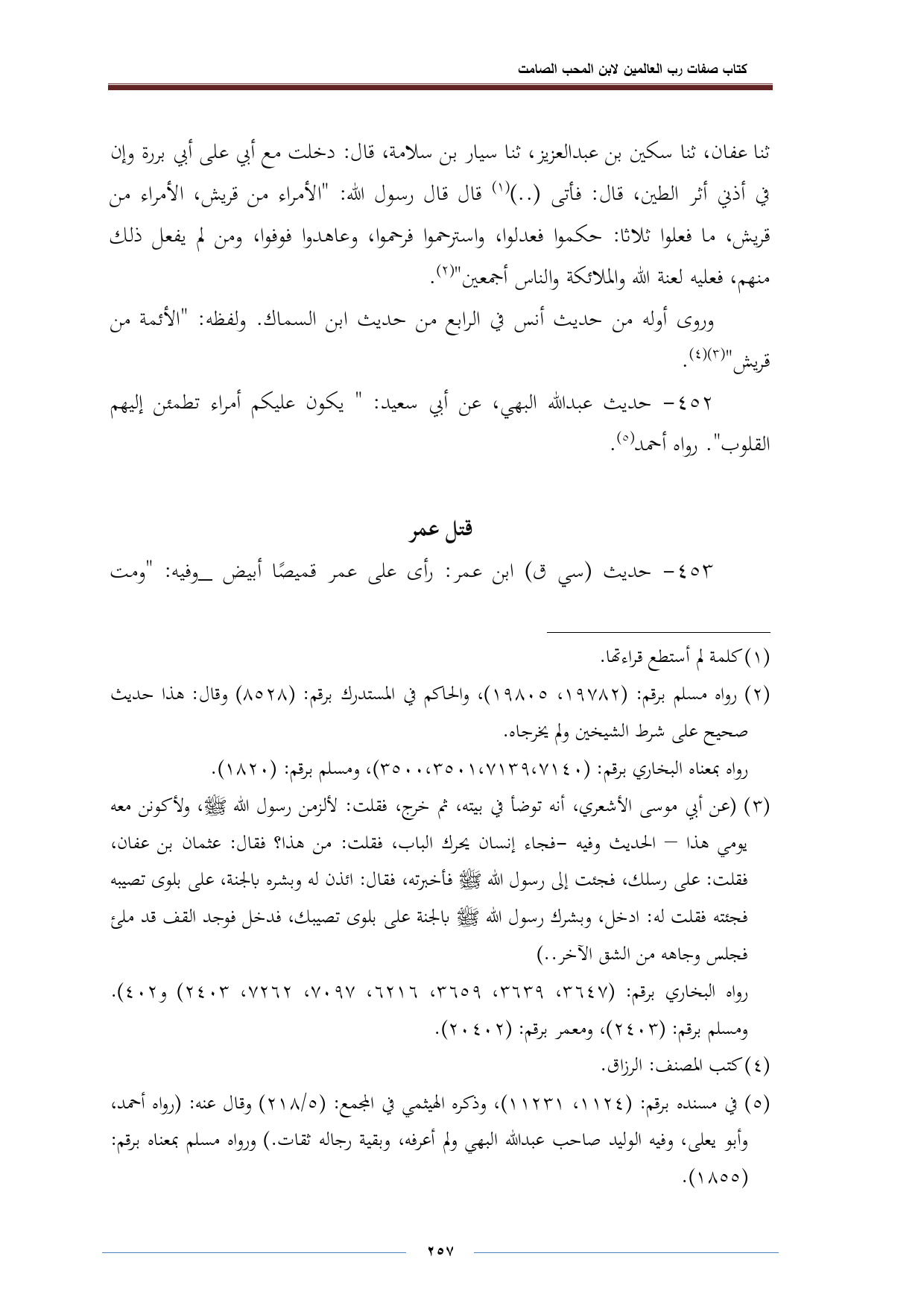 ٤٥٣ - حديث (سي ق) ابن عمر: رأى على عمر قميصًا أبيض - وفيه: "ومت