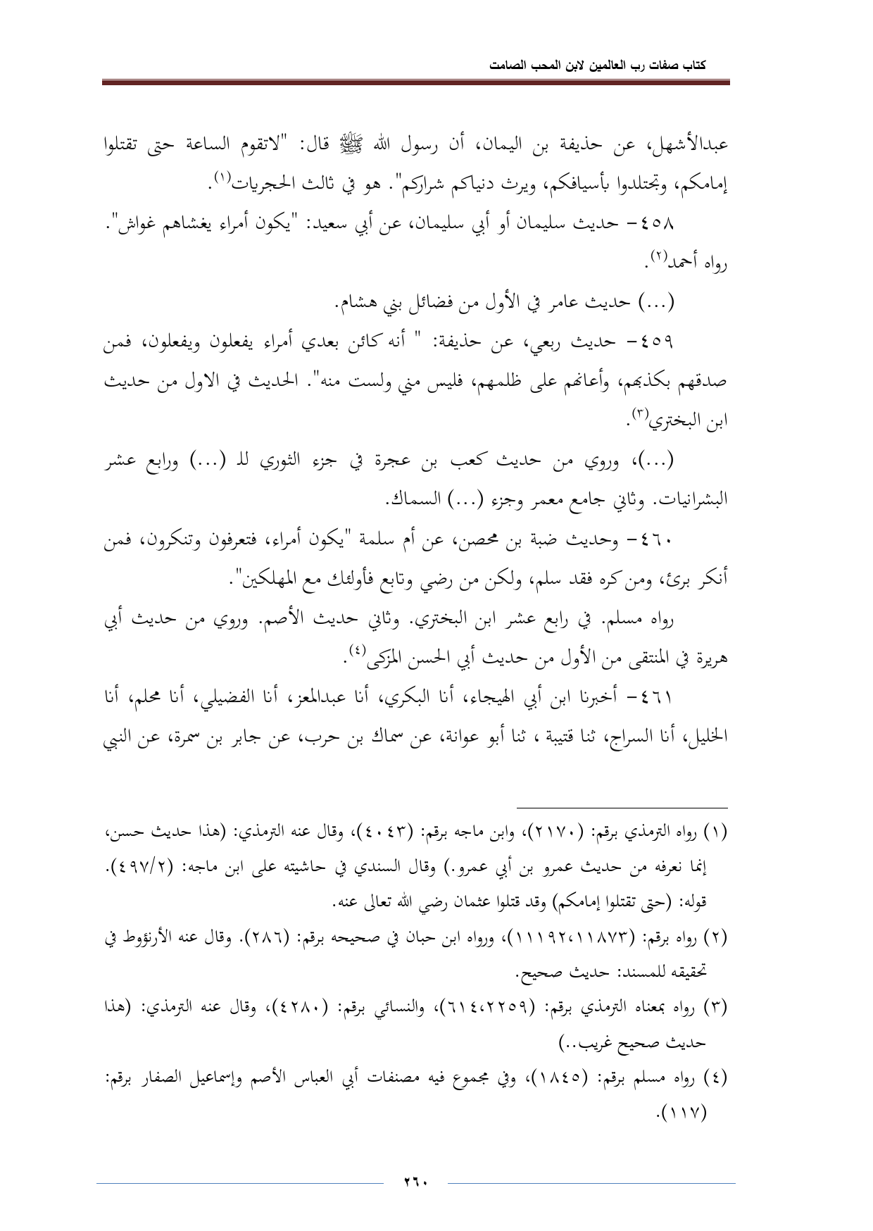 ٤٦٠ - وحديث ضبة بن محصن، عن أم سلمة "يكون أمراء، فتعرفون وتنكرون، فمن أنكر برئ، ومن كره فقد سلم، ولكن من رضي وتابع فأولئك مع المهلكين".