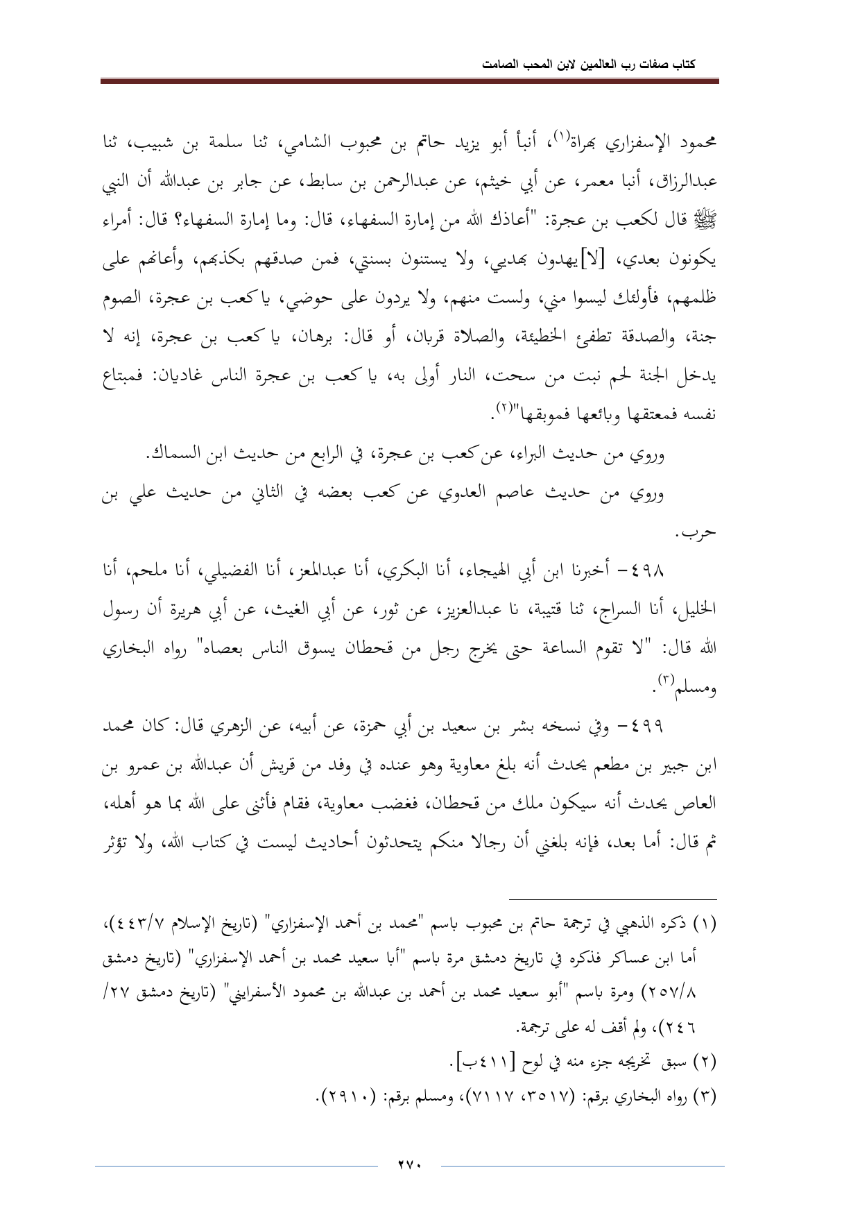 محمود الإسفزاري بهراة (¬١)، أنبأ أبو يزيد حاتم بن محبوب الشامي، ثنا سلمة بن شبيب، تنا عبد الرزاق، أنبا معمر، عن أبي خيثم، عن عبد الرحمن بن سابط، عن جابر بن عبد اللّه أن النبي - صلى الله عليه وسلم - قال لكعب بن عجرة: "أعاذك اللّه من إمارة السفهاء، قال: وما إمارة السفهاء؟ قال: أمراء يكونون بعدي، [لا] يهدون بهديي، ولا يستنون بسنتي، فمن صدقهم بكذبهم، وأعانهم على ظلمهم، فأولئك ليسوا مني، ولست منهم، ولا يردون على حوضي، يا كعب بن عجرة، الصوم جنة، والصدقة تطفئ الخطيئة، والصلاة قربان، أو قال: برهان، يا كعب بن عجرة، إنه لا يدخل الجنة لحم نبت من سحت، النار أولى به، يا كعب بن عجرة الناس غاديان: فمبتاع نفسه فمعتقها وبائعها فموبقها" (¬٢).