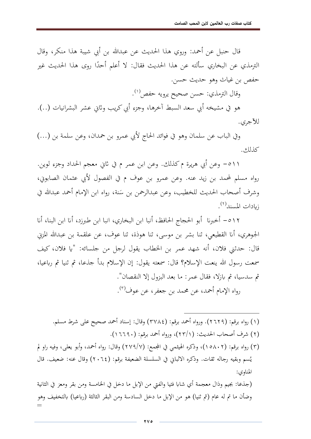 قال حنبل عن أحمد: وروي هذا الحديث عن عبد اللّه بن أبي شيبة هذا منكر، وقال الترمذي عن البخاري سألته عن هذا الحديث فقال: لا أعلم أحدًا روى هذا الحديث غير حفص بن غياث وهو حديث حسن.