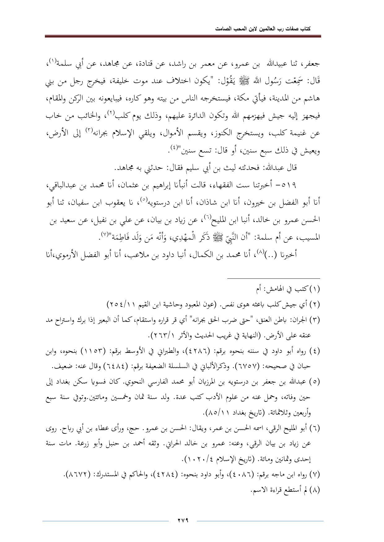 ٥١٩ - أخبرتنا ست الفقهاء، قالت أنبأنا إبراهيم بن عثمان، أنا محمد بن عبد الباقي، أنا أبو الفضل بن خيرون، أنا ابن شاذان، أنا ابن درستويه (¬٥)، نا يعقوب ابن سفيان، ثنا أبو الحسن عمرو بن خالد، أنبا ابن المليح (¬٦)، عن زياد بن بيان، عن علي بن نفيل، عن سعيد بن المسيب، عن أم سلمة: "أن النَّبي - صلى الله عليه وسلم - ذَكَر الْمهْدِي، وَأنّه مَن وَلَد فَاطِمَة" (¬٧).