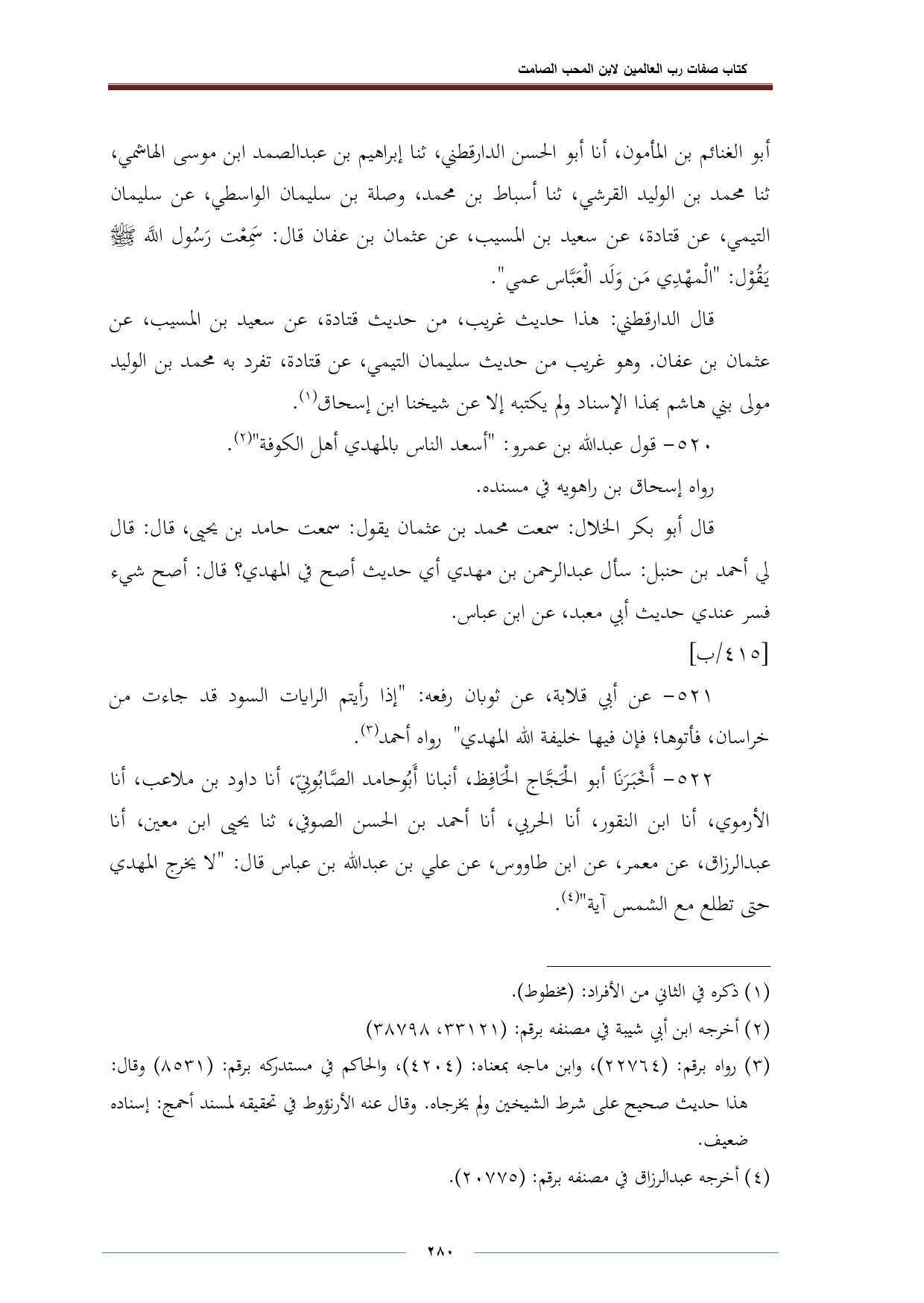 أبو الغنائم بن المأمون، أنا أبو الحصن الدارقطني، ثنا إبراهيم بن عبد الصمد ابن موسى الهاشمي، ثنا محمد بن الوليد القرشي، ثنا أسباط بن محمد، وصلة بن سليمان الواسطي، عن سليمان التيمي، عن قتادة، عن سعيد بن المسيب، عن عثمان بن عفان قال: سَمِعْت رَسُول اللَّه - صلى الله عليه وسلم - يَقُوْل: "الْمهْدِي مَن وَلَد الْعَبَّاس عمي".