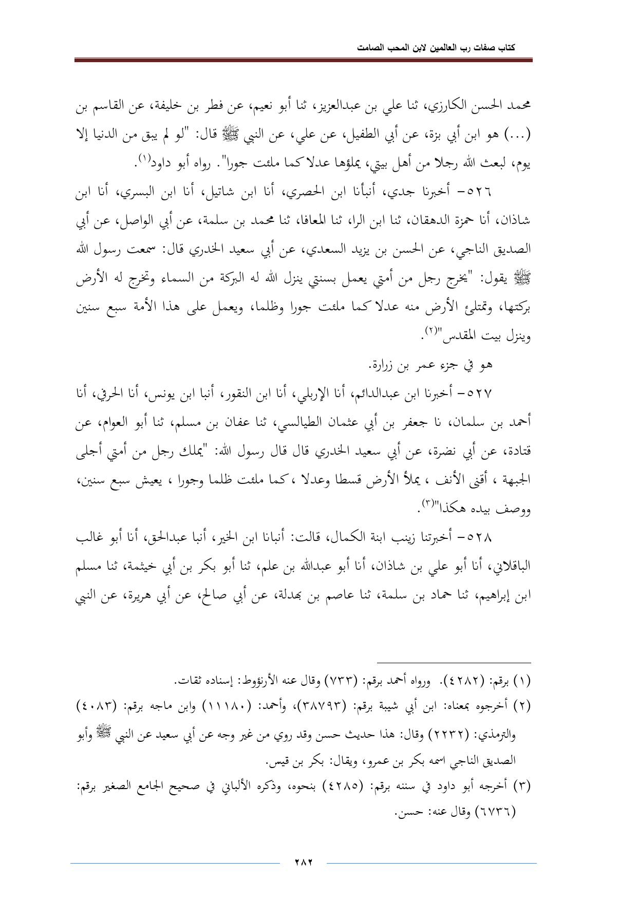 ٥٢٧ - أخبرنا ابن عبد الدائم، أنا الإربلي، أنا ابن النقور، أنبا ابن يونس، أنا الحرفي، أنا أحمد بن سلمان، نا جعفر بن أبي عثمان الطيالسي، ثنا عفان بن مسلم، ثنا أبو العوام، عن قتادة، عن أبي نضرة، عن أبي سعيد الخدري قال قال رسول اللِّه: "يملك رجل من أمتي أجلى الجبهة، أقنى الأنف، يملأ الأرض قسطا وعدلا، كما ملئت ظلما وجورا، يعيش سبع سنين، ووصف بيده هكذا" (¬٣).