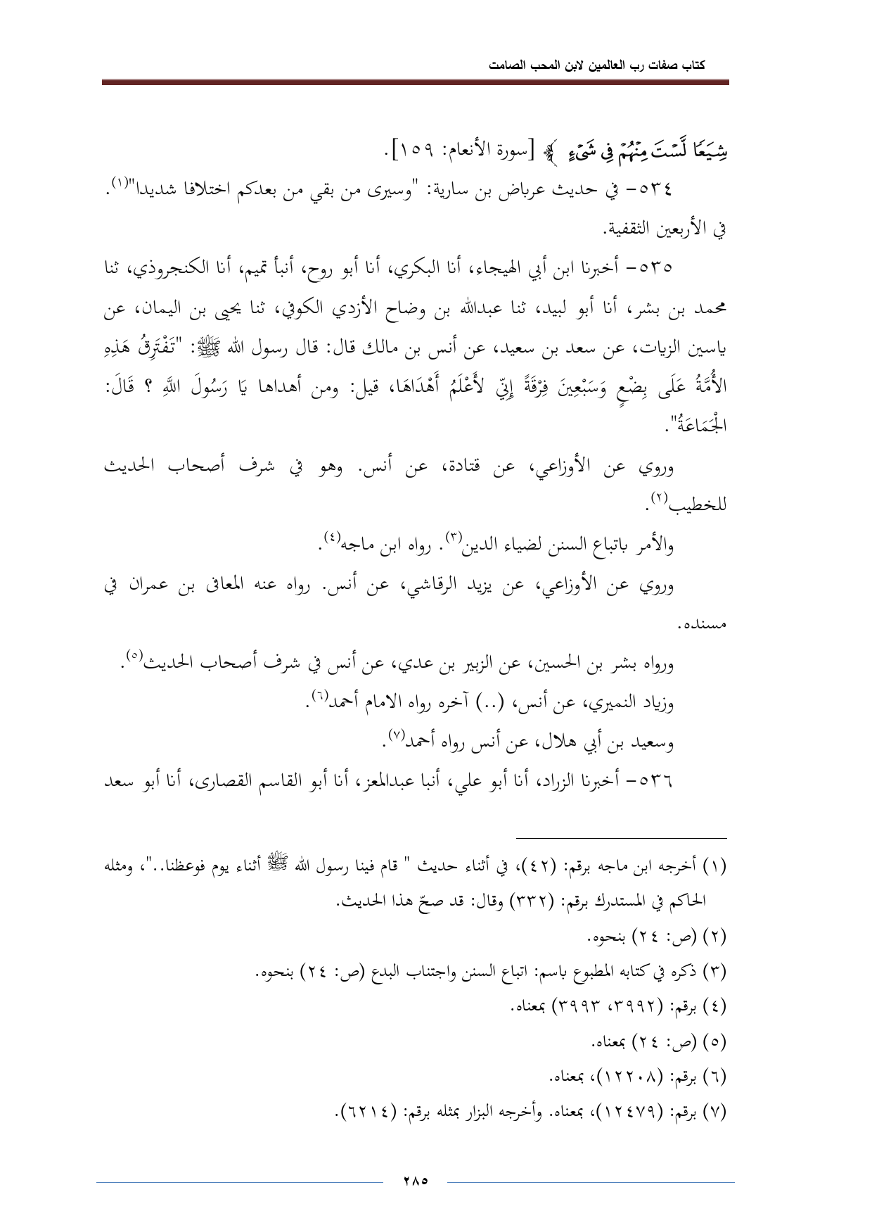 ٥٣٥ - أخبرنا ابن أبي الهيجاء، أنا البكري، أنا أبو روح، أنبأ تميم، أنا الكنجروذي، ثنا محمد بن بشر، أنا أبو لبيد، ثنا عبد اللّه بن وضاح الأزدي الكوفي، ثنا يحيى بن اليمان، عن ياسين الزيات، عن سعد بن سعيد، عن أنس بن مالك قال: قال رسول اللّه - صلى الله عليه وسلم -: "تَفْتَرِقُ هَذِهِ الأُمَّةُ عَلَى بِضْعٍ وَسَبْعِينَ فِرْقَةً إِنِّي لأَعْلَمُ أَهْدَاهَا، قيل: ومن أهداها يَا رَسُولَ اللَّهِ؛ قَالَ: الجمَاعَةُ".