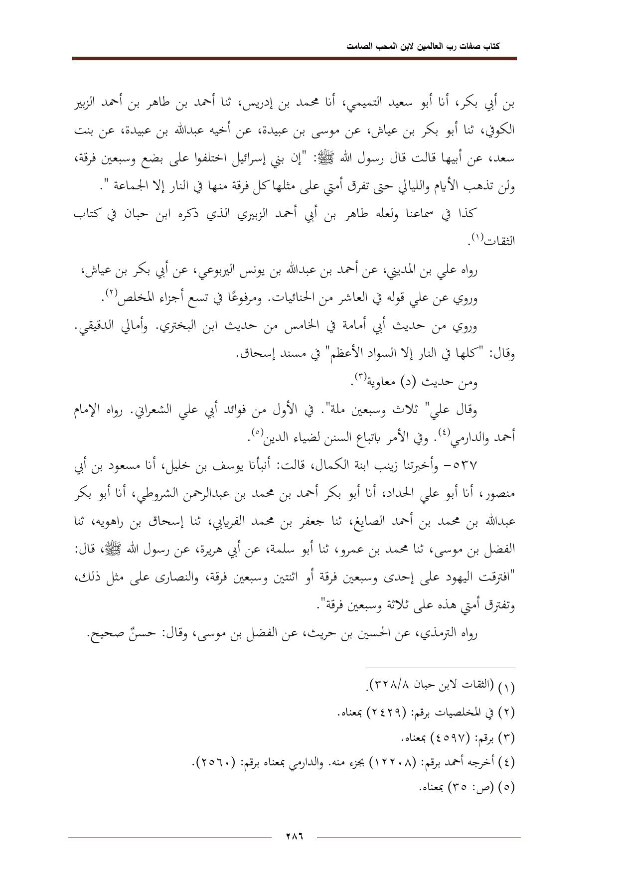 ٥٣٧ - وأخبرتنا زينب ابنة الكمال، قالت: أنبأنا يوسف بن خليل، أنا مسعود بن أبي منصور، أنا أبو علي الحداد، أنا أبو بكر أحمد بن محمد بن عبد الرحمن الشروطي، أنا أبو بكر عبد اللّه بن محمد بن أحمد الصايغ، ثنا جعفر بن محمد الفريابي، ثنا إسحاق بن راهويه، ثنا الفضل بن موسى، ثنا محمد بن عمرو، ثنا أبو سلمة، عن أبي هريرة، عن رسول اللّه - صلى الله عليه وسلم -، قال: "افترقت اليهود على إحدى وسبعين فرقة أو اثنتين وسبعين فرقة، والنصارى على مثل ذلك، وتفترق أمتي هذه على ثلاثة وسبعين فرقة".