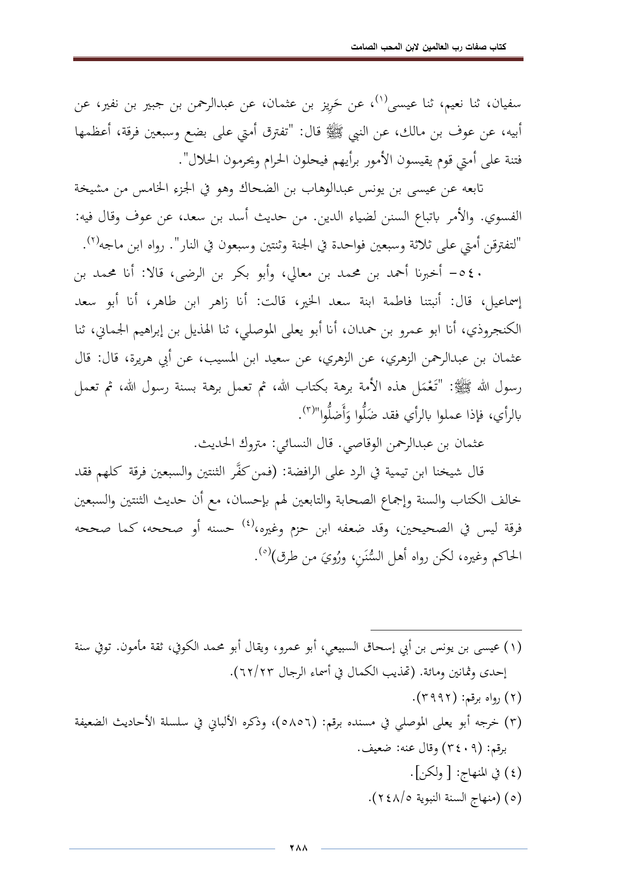 قال شيخنا ابن تيمية في الرد على الرافضة: (فمن كفَّر الثنتين والسبعين فرقة كلهم فقد خالف الكتاب والسنة وإجماع الصحابة والتابعين لهم بإحسان، مع أن حديث الثنتين والسبعين فرقة ليس في الصحيحين، وقد ضعفه ابن حزم وغيره، (¬٤) حسنه أو صححه، كما صححه الحاكم وغيره، لكن رواه أهل السُّنَنِ، ورُويَ من طرق) (¬٥).