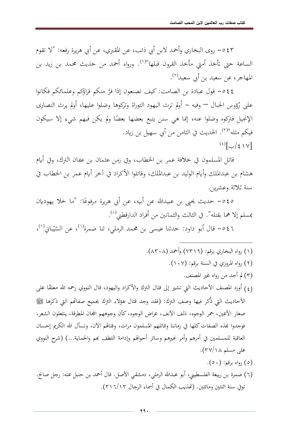 (¬٤) أورد المصنف الأحاديث التي تشير إلى قتال الترك والأكراد واليهود، قال النووي رحمه اللّه معلقًا على الأحاديث التي ذكُر فيها وصف الترك: (فقد وجد قتال هؤلاء الترك بجميع صفاتهم التي ذكرها - صلى الله عليه وسلم - صغار الأعين، حمر الوجوه، ذلف الآنف، عراض الوجوه، كأن وجوههم المجان المطرقة، ينتعلون الشعر، فوجدوا بهذه الصفات كلها في زماننا وقاتلهم المسلمون مرات، وقتالهم الآن، ونسأل اللّه الكريم إحسان العاقبة للمسلمين في أمرهم وأمر غيرهم وسائر أحوالهم وإدامة اللطف بهم والحماية ... ) (شرح النووي على مسلم ١٨/ ٣٧).