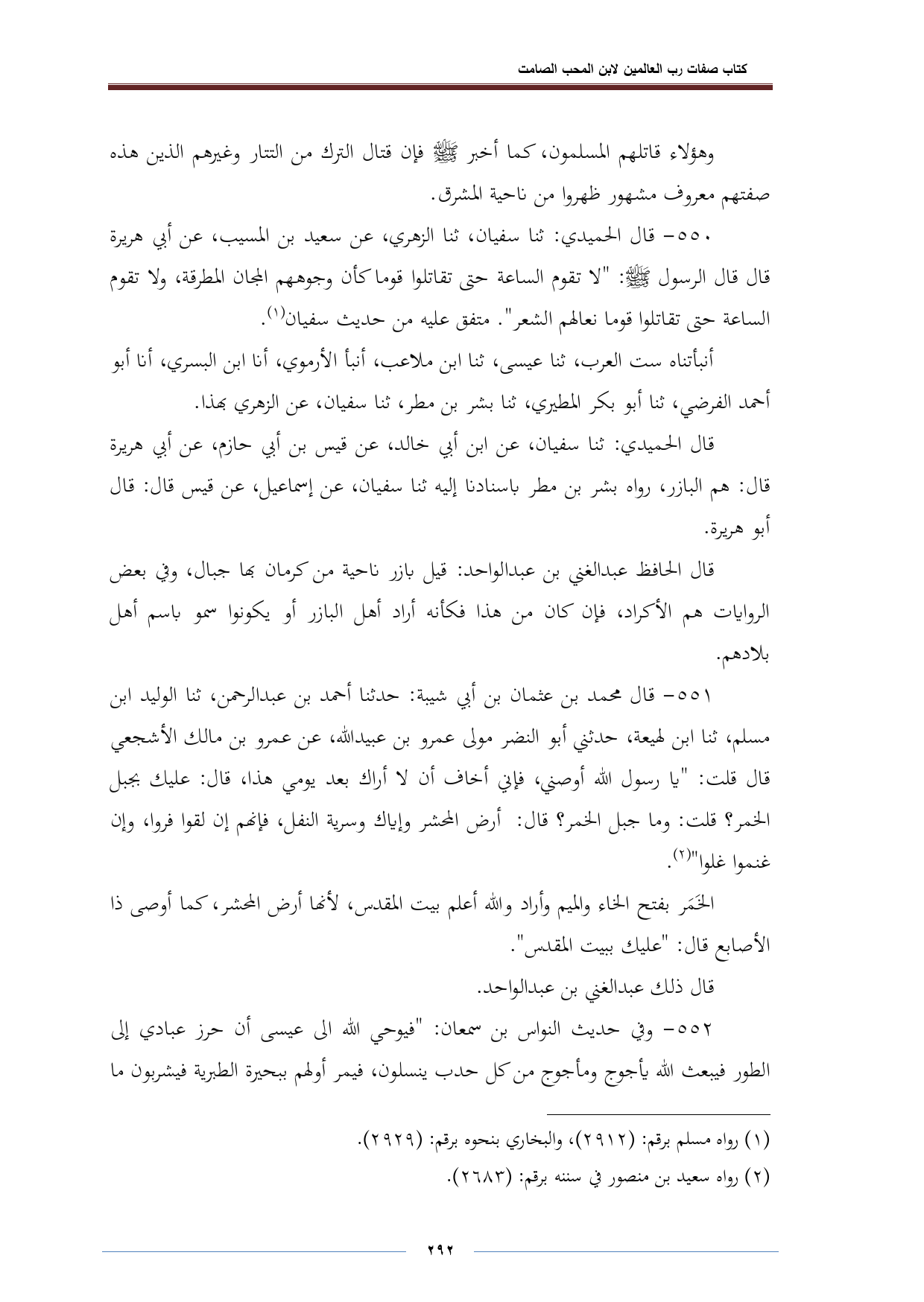 ٥٥٠ - قال الحميدي: ثنا سفيان، ثنا الزُّهري، عن سعيد بن المسيب، عن أبي هريرة قال قال الرسول - صلى الله عليه وسلم -: "لا تقوم السماعة حتى تقاتلوا قوما كأن وجوههم المجان المطرقة، ولا تقوم الساعة حتى تقاتلوا قوما نعالهم الشعر". متفق عليه من حديث سفيان (¬١).