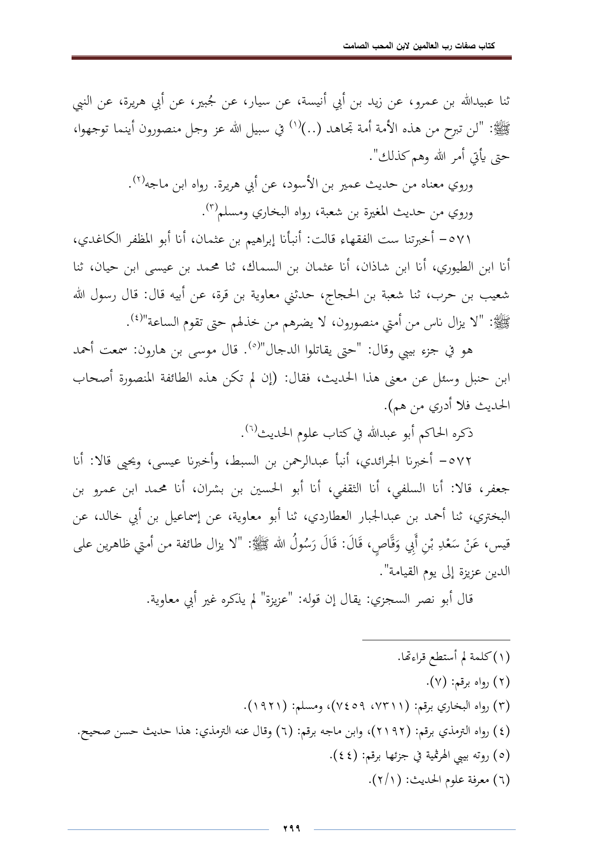 ٥٧١ - أخبرتنا ست الفقهاء قالت: أنبأنا إبراهيم بن عثمان، أنا أبو المظفر الكاغدي، أنا ابن الطيوري، أنا ابن شاذان، أنا عثمان بن السمالث، ثنا محمد بن عيسى ابن حيان، ثنا شعيب بن حرب، ثنا شعبة بن الحجاج، حَدَّثَنِي معاوية بن قرة، عن أبيه قال: قال رسول اللّه - صلى الله عليه وسلم -: "لا يزال ناس من أمتي منصورون، لا يضرهم من خذلهم حتى تقوم الساعة" (¬٤).
