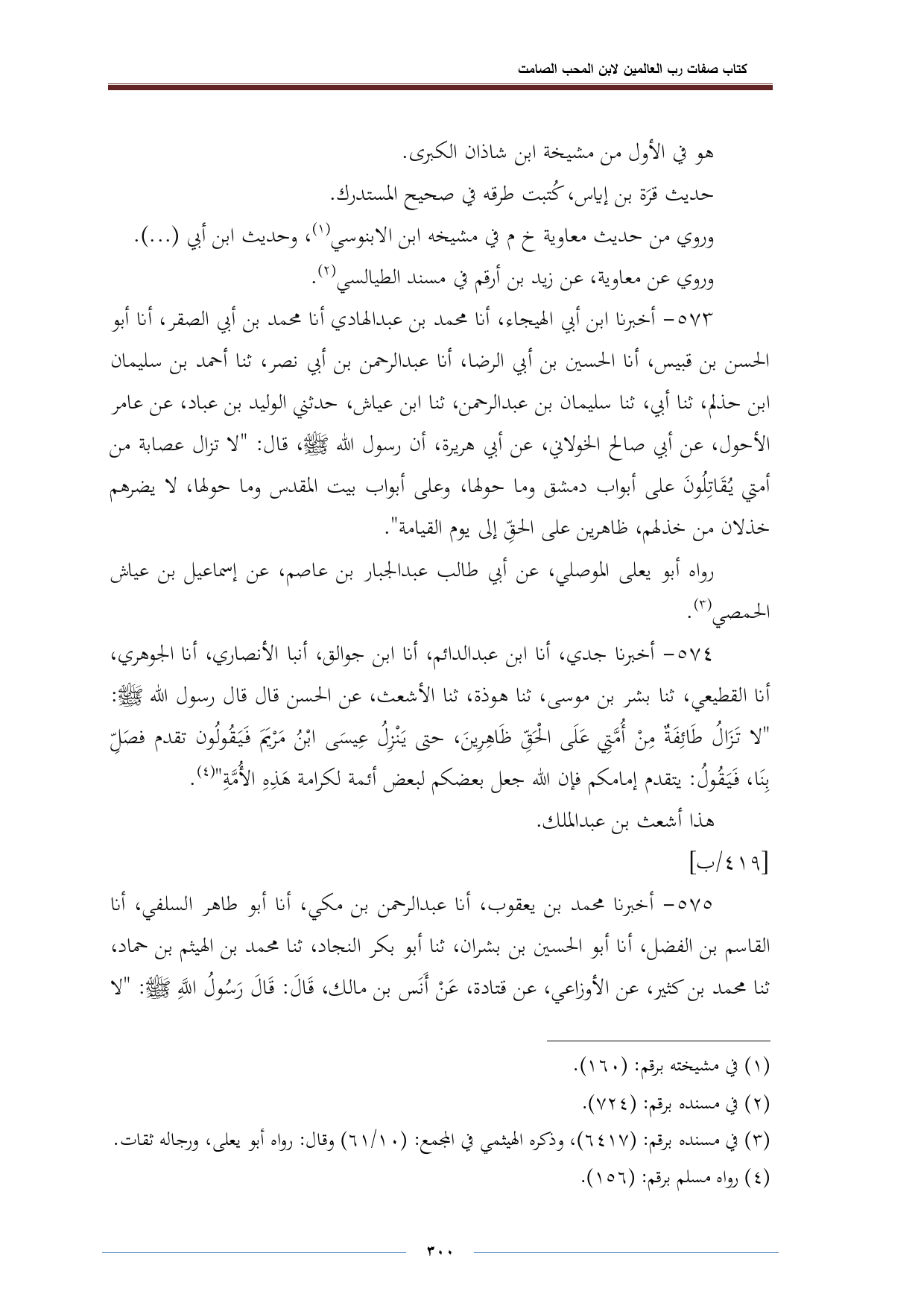 ٥٧٣ - أخبرنا ابن أبي الهيجاء، أنا محمد بن عبد الهادي أنا محمد بن أبي الصقر، أنا أبو الحسن بن قبيس، أنا الحسين بن أبي الرضا، أنا عبد الرحمن بن أبي نصر، ثنا أحمد بن سليمان ابن حذلم، ثنا أبي، ثنا سليمان بن عبد الرحمن، ثنا ابن عياش، حَدَّثَنِي الوليد بن عباد، عن عامر الأحول، عن أبي صالح الخولاني، عن أبي هريرة، أن رسول اللِّه - صلى الله عليه وسلم -، قال: "لا تزال عصابة من أمتي يُقَاتِلُونَ على أبواب دمشق وما حولها، وعلى أبواب بيت المقدس وما حولها، لا يضرهم خذلان من خذلهم، ظاهرين على الحقِّ إلى يوم القيامة".