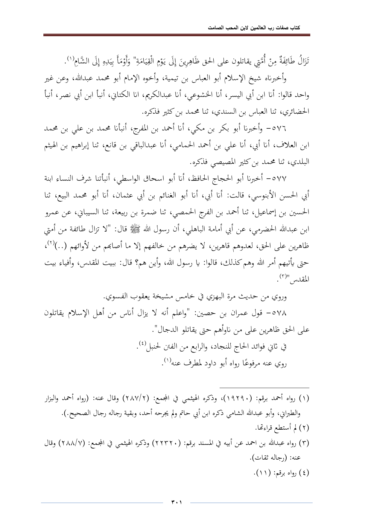 ٥٧٧ - أخبرنا أبو الحجاج الحافظ، أنا أبو إسحاق الواسطي، أنبأتنا شرف النساء ابنة أبي الحسن الأبنوسي، قالت: أنا أبى، أنا أبو الغنائم بن أبي عثمان، أنا أبو محمد البيع، ثنا الحسين بن إسماعيل، ثنا أحمد بن الفرج الحمصي، ثنا ضمرة بن ربيعة، ثنا السيباني، عن عمرو ابن عبد الله الحضرمي، عن أبي أمامة الباهلي، أن رسول الله - صلى الله عليه وسلم - قال: "لا تزال طائفة من أمتي ظاهرين على الحق، لعدوهم قاهرين، لا يضرهم من خالفهم إلا ما أصابهم من لأوأئهم ( .. ) (¬٢)، حتى يأتيهم أمر الله وهم كذلك، قالوا: يا رسول الله، وأين هم؟ قال: ببيت المقدس، وأفياء بيت المقدس" (¬٣).