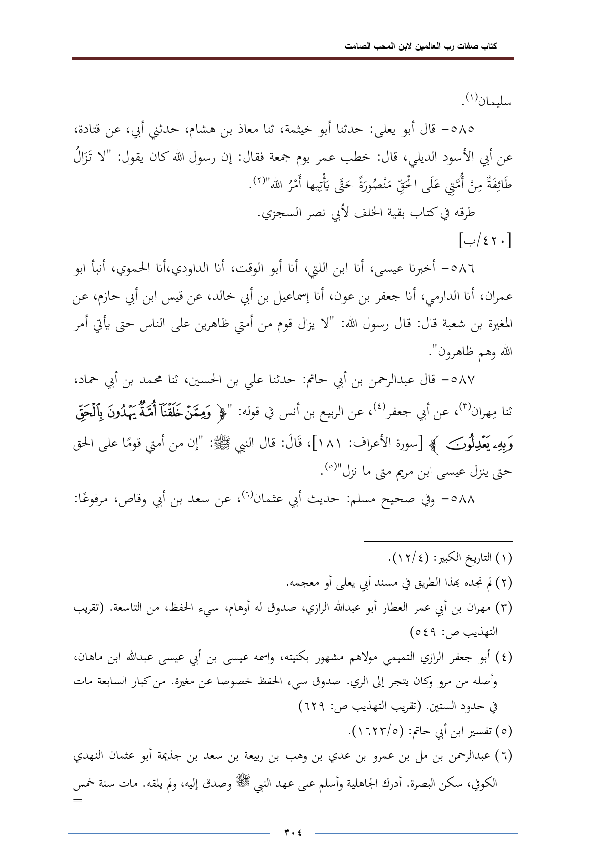 ٥٨٧ - قال عبد الرحمن بن أبي حاتم: حدثنا علي بن الحسين، ثنا محمد بن أبي حماد، ثنا مِهران (¬٣)، عن أبي جعفر (¬٤)، عن الربيع أنس في قوله: " {وَمِمَّنْ خَلَقْنَا أُمَّةٌ يَهْدُونَ بِالْحَقِّ وَبِهِ يَعْدِلُونَ} [سورة الأعراف: ١٨١]، قَالَ: قال النبي - صلى الله عليه وسلم -: "إن من أمتي قومًا على الحق حتى ينزل عيسى ابن مريم متى ما نزل" (¬٥).