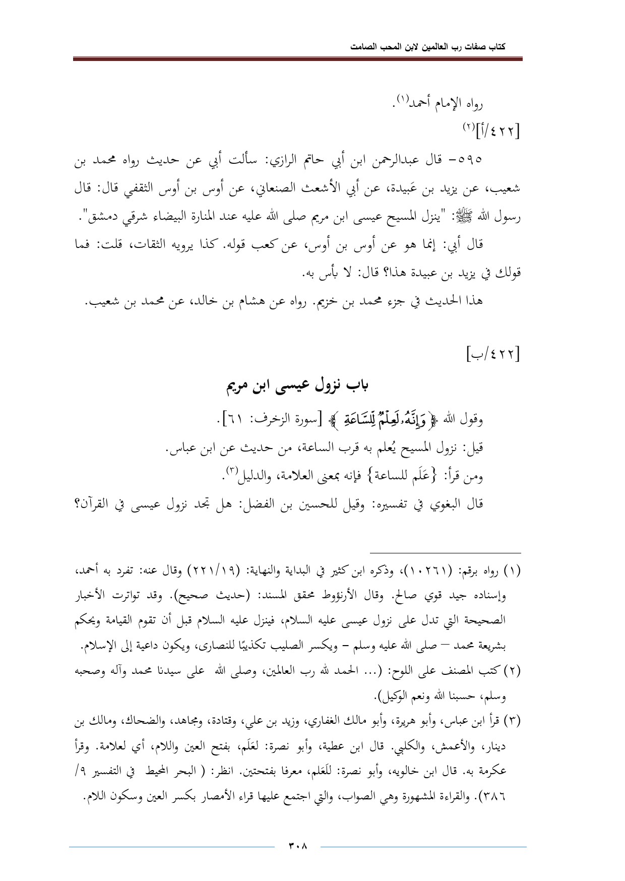 ٥٩٥ - قال عبد الرحمن ابن أبي حاتم الرازي: سألت أبي عن حديث رواه محمد بن شعيب، عن يزيد بن عَبيدة، عن أبي الأشعث الصنعاني، عن أوس بن أوس الثقفي قال: قال رسول الله - صلى الله عليه وسلم -: "ينزل المسيح عيسى ابن مريم صلى الله عليه عند المنارة البيضاء شرقي دمشق".