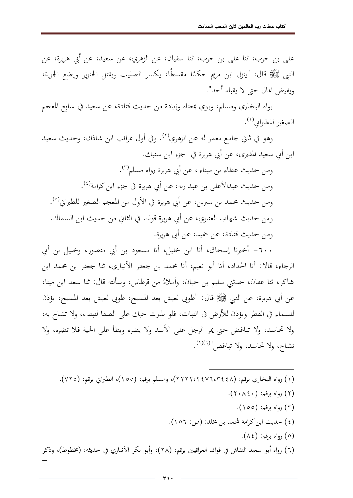 علي بن حرب، ثنا علي بن حرب، ثنا سفيان، عن الزهري، عن سعيد، عن أبي هريرة، عن النبي - صلى الله عليه وسلم - قال: "ينزل ابن مريم حكمًا مقسطًا، يكسر الصليب ويقتل الخنزير ويضع الجزية، ويفيض المال حتى لا يقبله أحد".
