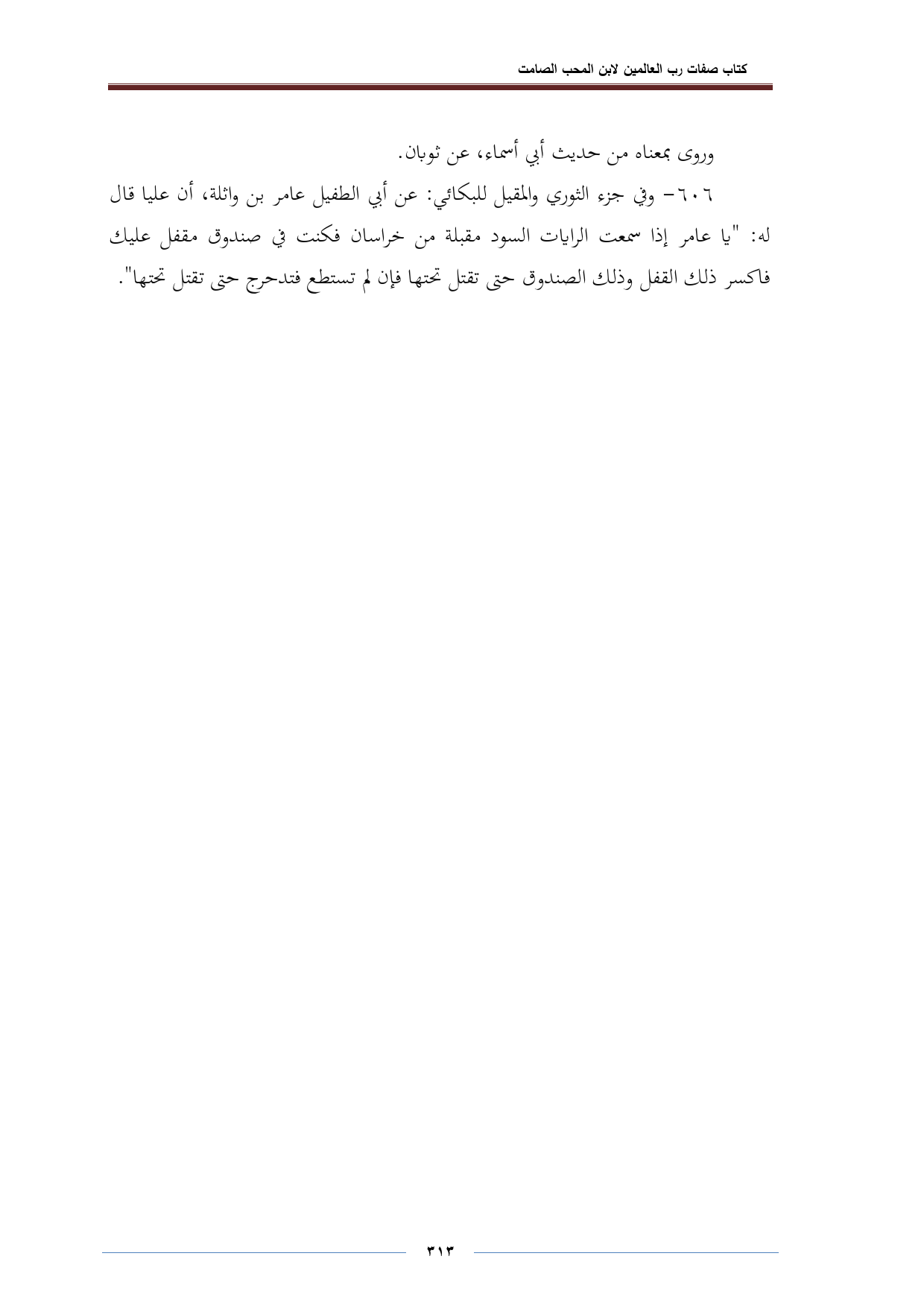 ٦٠٦ - وفي جزء الثوري والمقيل للبكائي: عن أبي الطفيل عامر بن واثلة، أن عليا قال له: "يا عامر إذا سمعت الرايات السود مقبلة من خراسان فكنت في صندوق مقفل عليك فاكسر ذلك القفل وذلك الصندوق حتى تقتل تحتها فإن لم تستطع فتدحرج حتى تقتل تحتها".