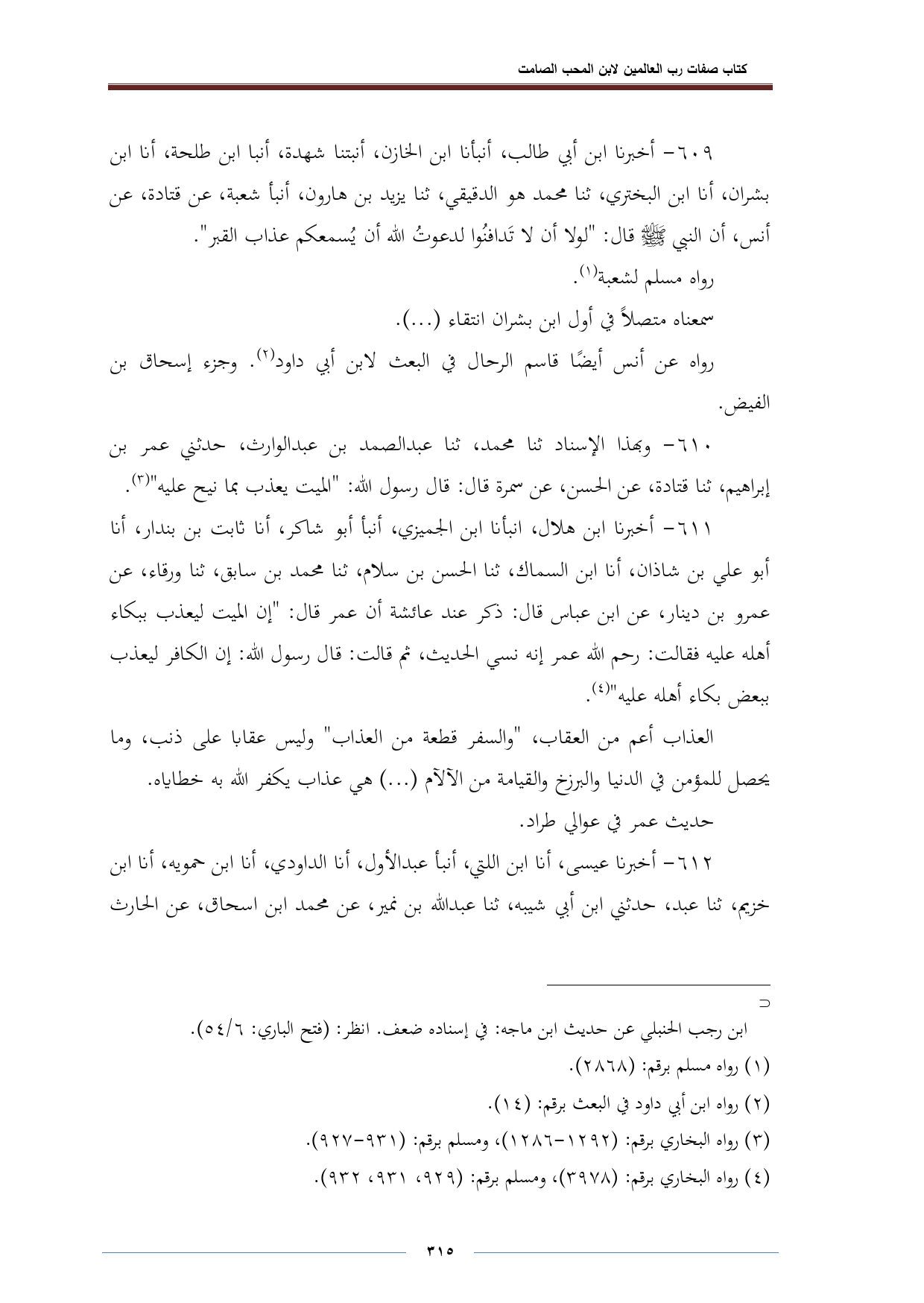 ٦٠٩ - أخبرنا ابن أبي طالب، أنبأنا ابن الخازن، أنبتنا شهدة، أنبا ابن طلحة، أنا ابن بشران، أنا ابن البختري، ثنا محمد هو الدقيقي، ثنا يزيد بن هارون، أنبأ شعبة، عن قتادة، عن أنس، أن النبي - صلى الله عليه وسلم - قال: "لولا أن لا تَدافنُوا لدعوتُ الله أن يُسمعكم عذاب القبر".