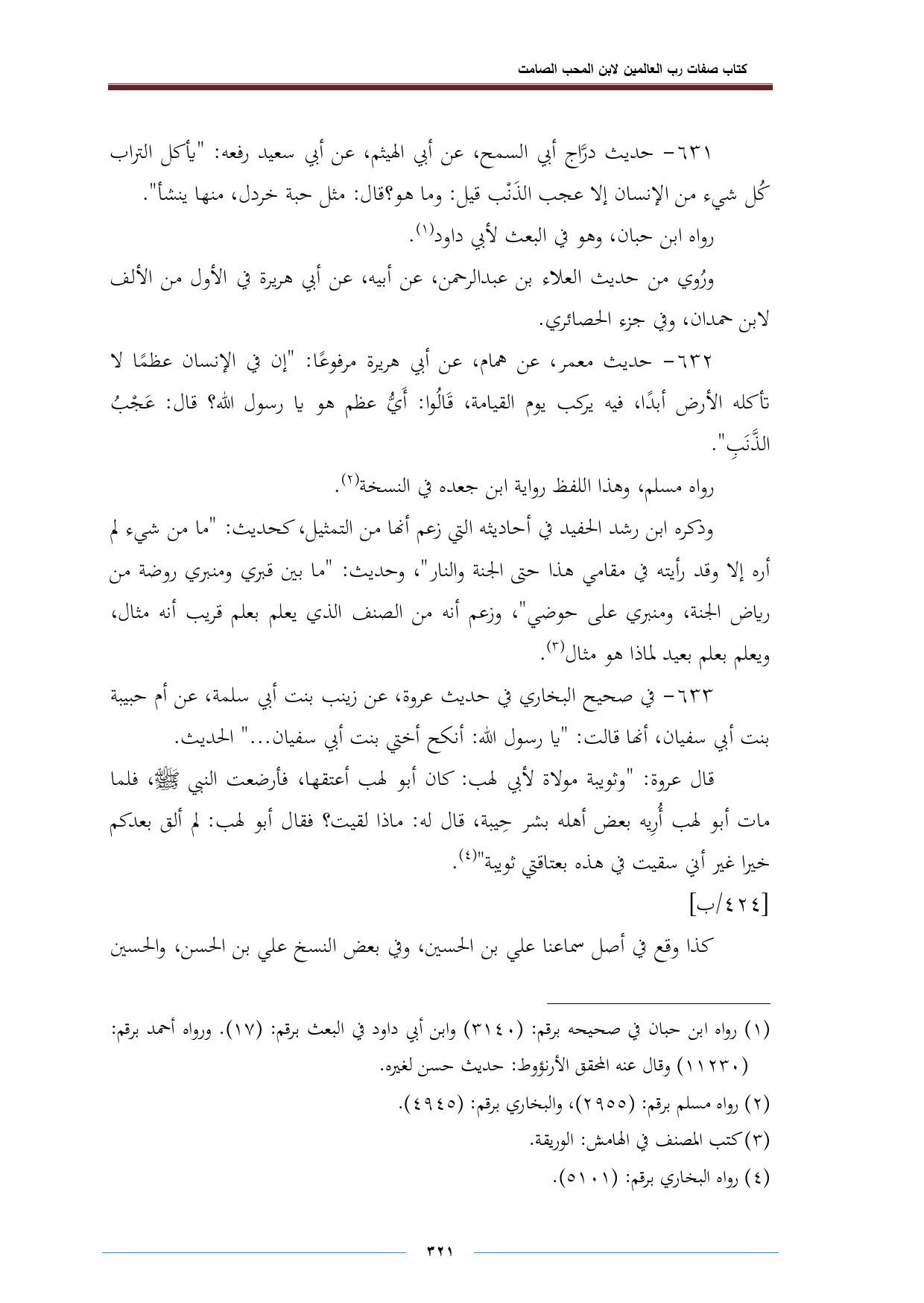 (¬١) رواه ابن حبان في صحيحه برقم: (٣١٤٠) وابن أبي داود في البعث برقم: (١٧). ورواه أحمد برقم: (١١٢٣٠) وقال عنه المحقق الأرنؤوط: حديث حسن لغيره.