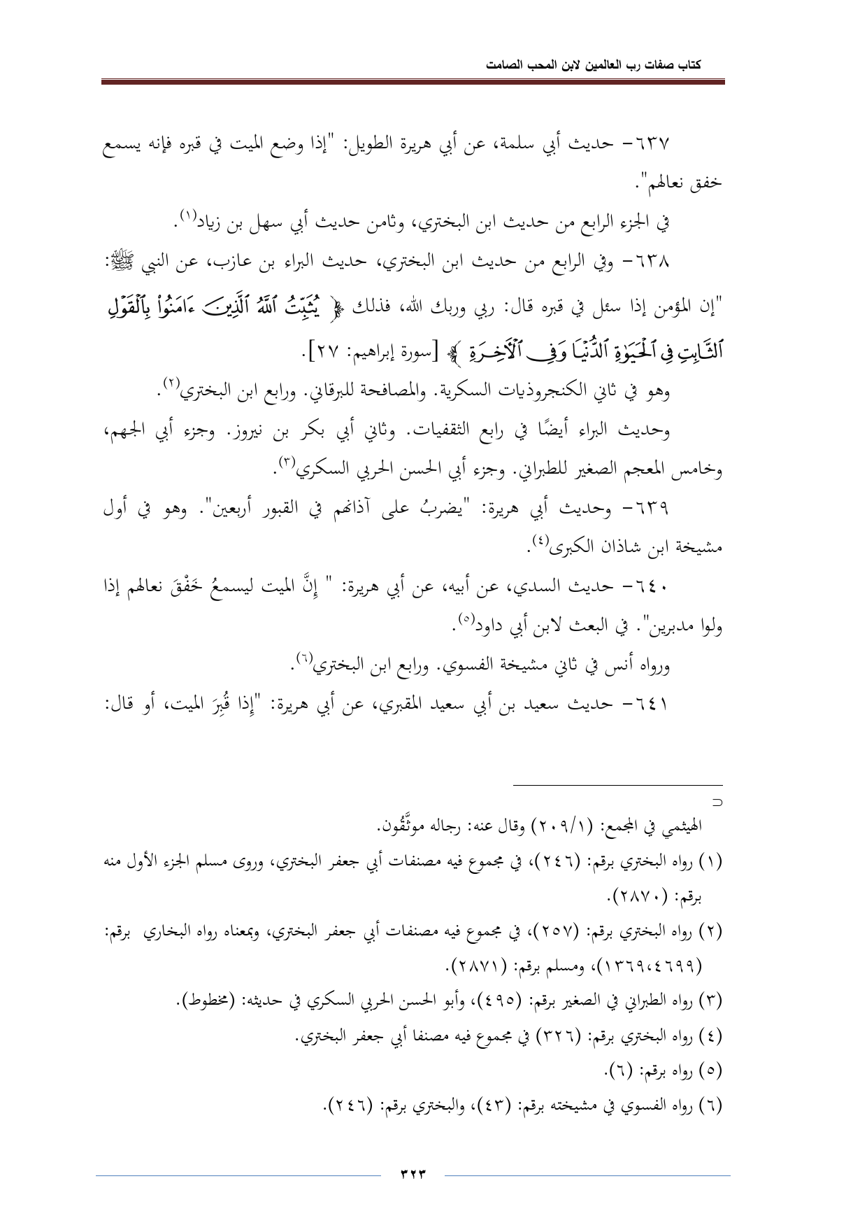 ٦٤٠ - حديث السدي، عن أبيه، عن أبي هريرة: "إِنِّ الميت ليسمعُ خَفْقَ نعالهم إذا ولوا مدبرين". في البعث لابن أبي داود (¬٥).