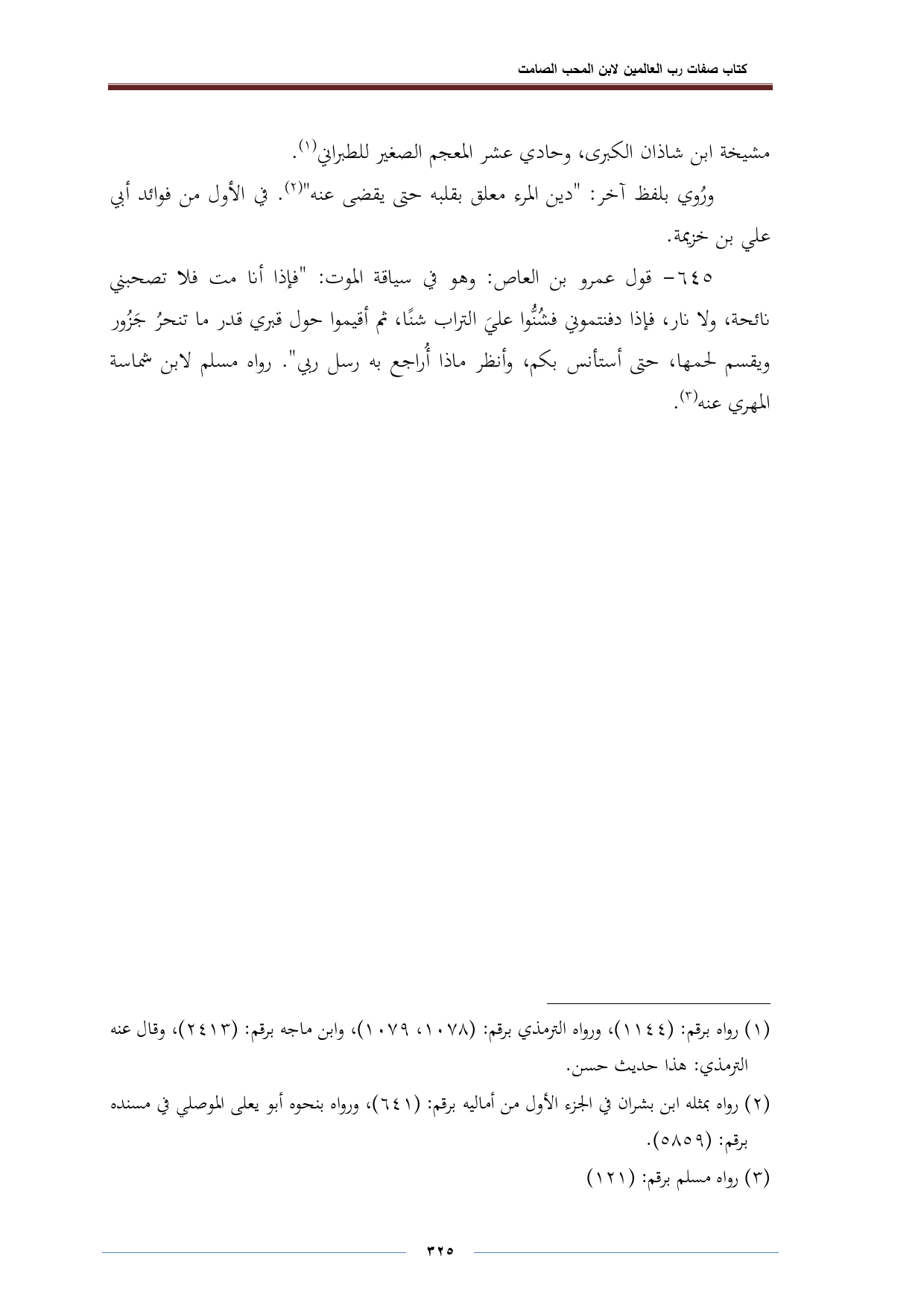 ٦٤٥ - قول عمرو بن العاص: وهو في سياقة الموت: "فإذا أنا مت فلا تصحبني نائحة، ولا نار، فإذا دفنتموني فشُنُّوا عليَ التراب شنًا، ثم أقيموا حول قبري قدر ما تنحرُ جَزُور ويقسم لحمها، حتى أستأنس بكم، وأنظر ماذا أُراجع به رسل ربى". رواه مسلم لابن شماسة المهري عنه (¬٣).