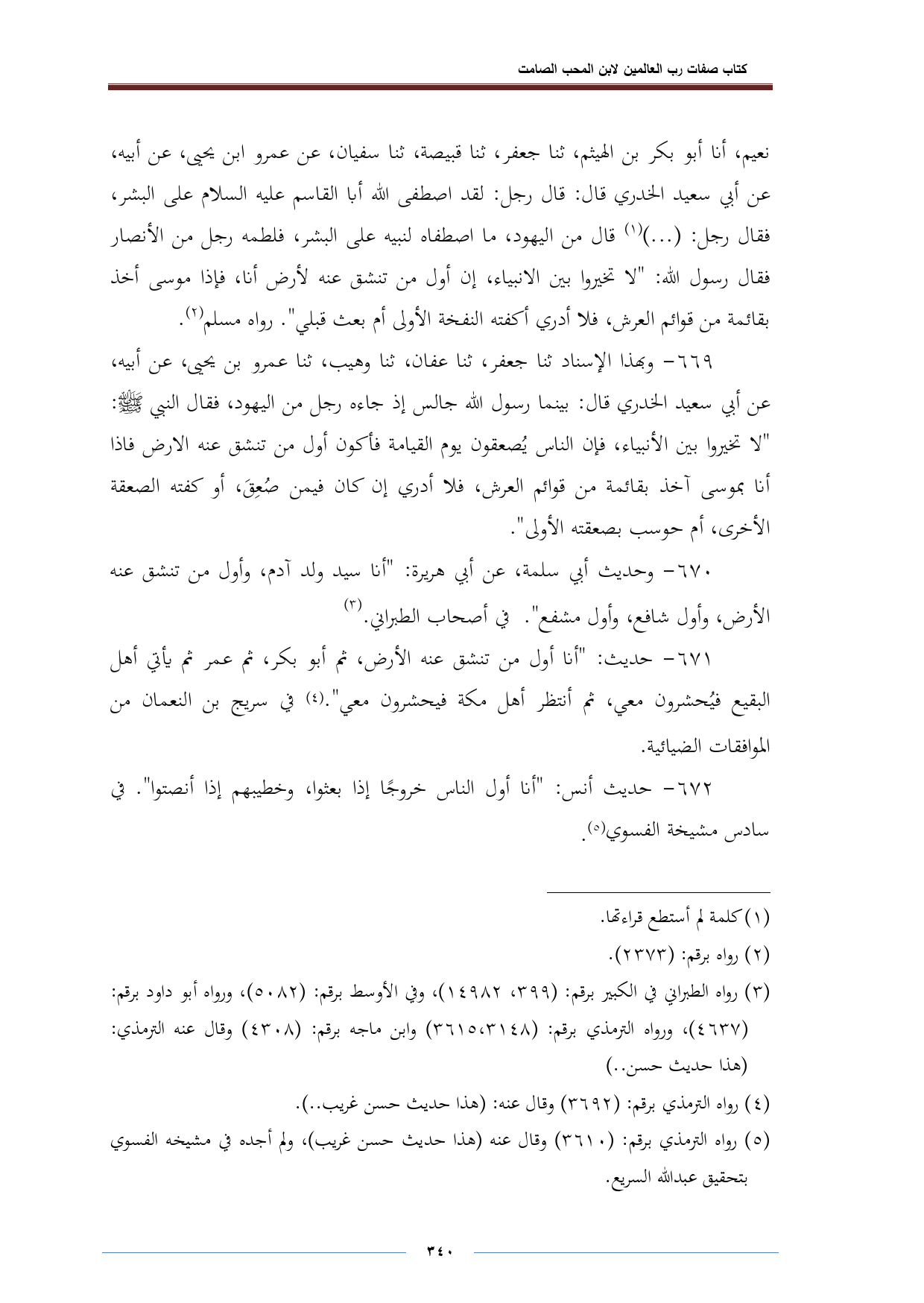 ٦٦٩ - وبهذا الإسناد ثنا جعفر، ثنا عفان، ثنا وهيب، ثنا عمرو يحيى، عن أبيه، عن أبي سعيد الخدري قال: بينما رسول الله جالس إذ جاءه رجل من اليهود، فقال الني - صلى الله عليه وسلم -: "لا تخيروا بين الأنبياء، فإن الناس يُصعقون يوم القيامة فأكون أول من تنشق عنه الأرض فإذا أنا بموسى آخذ بقائمة من قوائم العرش، فلا أدري إن كان فيمن صُعِقَ، أو كفته الصعقة الأخرى، أم حوسب بصعقته الأولى".