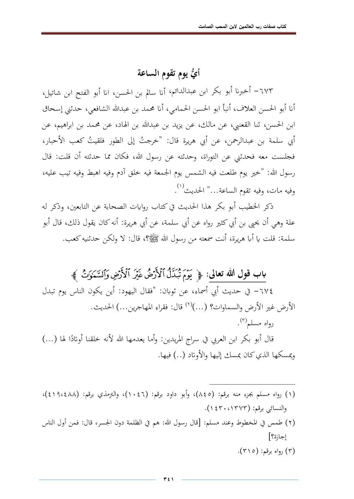 ٦٧٣ - أخبرنا أبو بكر ابن عبد الدائم، أنا سالم بن الحسن، انا أبو الفتع ابن شاتيل، أنا أبو الحصن العلاف، أنبأ أبو الحسن الحماصي، أنا محمد بن عبد الله الشافعي، حدثني إسحاق ابن الحسن، ثنا القعني، عن مالك، عن يزيد بن عبد الله بن الهاد، عن محمد بن إبراهيم، عن أبي سلمة بن عبد الرحمن، عن أبي هريرة قال: "خرجتُ إلى الطور فلقيتُ كعب الأحبار، فجلست معه فحدثني عن التوراة، وحدثته عن رسول الله، فكان مما حدثته أن قلت: قال رسول الله: "خير يوم طلعت فيه الشمس يوم الجمعة فيه خلق آدم وفيه اهبط وفيه تيب عليه، وفيه مات، وفيه تقوم الساعة ... " الحديث (¬١).