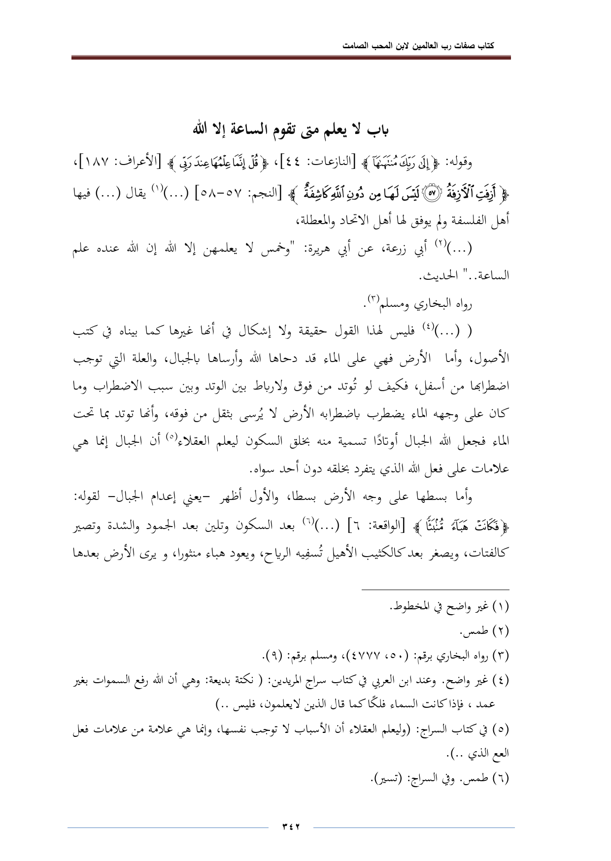 وقوله: {إِلَى رَبِّكَ مُنْتَهَاهَا} [النازعات: ٤٤]، {قُلْ إِنَّمَا عِلْمُهَا عِنْدَ اللَّهِ} مم [الأعراف: ١٨٧]، {أَزِفَتِ الْآزِفَةُ (٥٧) لَيْسَ لَهَا مِنْ دُونِ اللَّهِ كَاشِفَةٌ} [النجم: ٥٧ - ٥٨] ( ... ) (¬١) يقال ( ... ) فيها أهل الفلسفة ولم يوفق لها أهل الاتحاد والمعطلة،.
