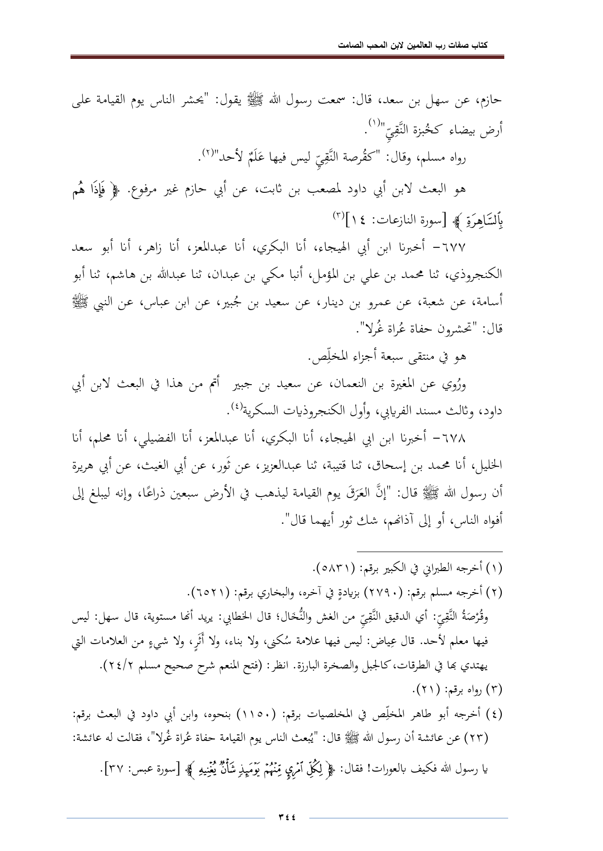 هو البعث لابن أبي داود لمصعب بن ثابت، عن أبي حازم غير مرفوع. {فَإِذَا هُمْ بِالسَّاهِرَةِ} [سورة النازعات: ١٤] (¬٣).