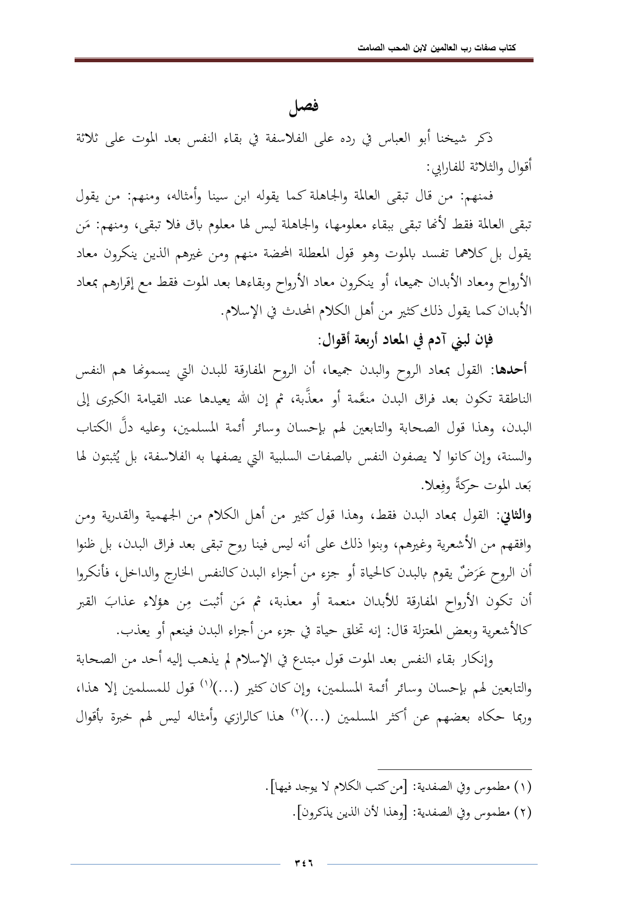 أحدهما: القول بمعاد الروح والبدن جميعا، أن الروح المفارقة للبدن التي يسمونها هم النفس الناطقة تكون بعد فراق البدن منعَّمة أو معذَّبة، ثم إن الله يعيدها عند الميامة الكبرى إلى البدن، وهذا قول الصحابة والتابعين لهم بإحسان وسائر أئمة المسلمين، وعليه دلَّ الكتاب والسنة، وإن كانوا لا يصفون النفس بالصفات السلبية التي يصفها به الفلاسفة، بل يُثبتون في بَعد الموت حركةً وفِعلا.
