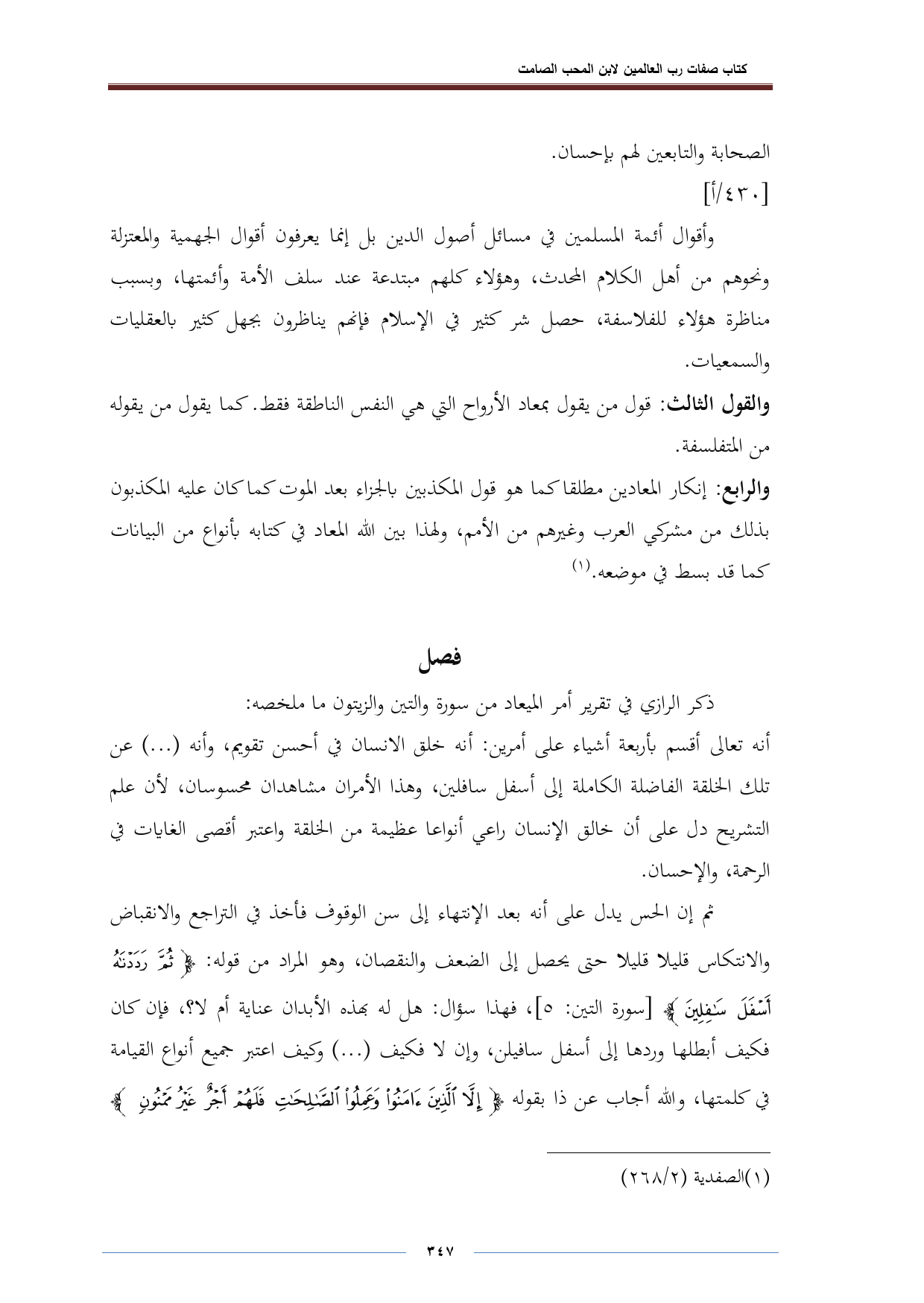ثم إن الحس يدل على أنه بعد الانتهاء إلى سن الوقوف فأخذ في التراجع والانقباض والانتكاس قليلا قليلا حتى يحصل إلى الضعف والنقصان، وهو المراد من قوله: {ثُمَّ رَدَدْنَاهُ أَسْفَلَ سَافِلِينَ} [سورة التين: ٥]، فهذا سؤال: هل له بهذه الأبدان عناية أم لا؟، فإن كان فكيف أبطلها وردها إلى أسفل سافيلن، وإن لا فكيف ( ... ) كيف اعتبر جميع أنواع القيامة في كلمتها، والله أجاب عن ذا بقوله {إِلَّا الَّذِينَ آمَنُوا وَعَمِلُوا الصَّالِحَاتِ فَلَهُمْ أَجْرٌ غَيْرُ مَمْنُونٍ}