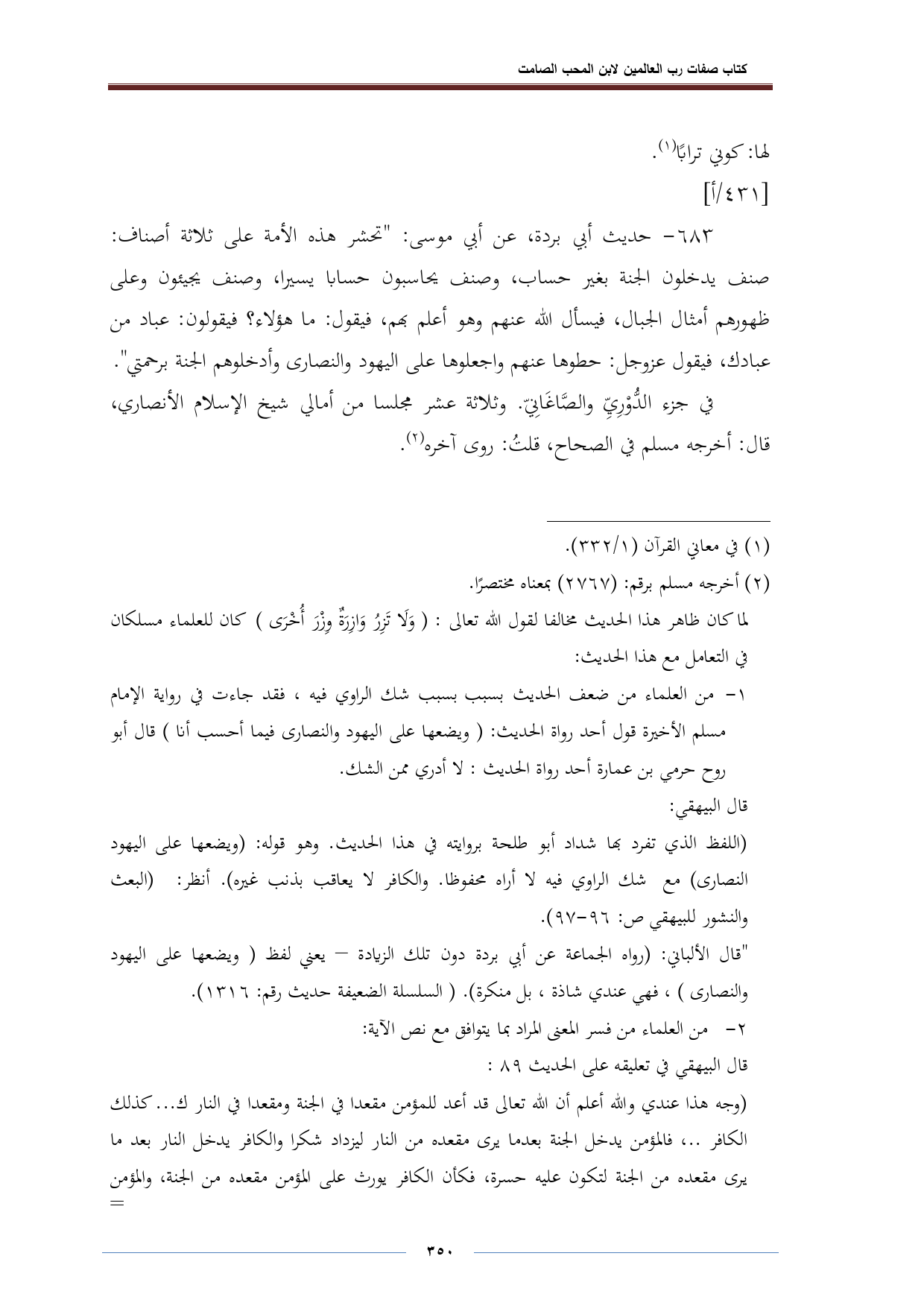 ٦٨٣ - حديث أبي بردة، عن أبي موسى: "تحشر هذه الأمة على ثلاثة أصناف: صنف يدخلون الجنة بغير حساب، وصنف يحاسبون حسابا يسيرا، وصنف يجيئون وعلى ظهورهم أمثال الجبال، فيسأل الله عنهم وهو أعلم بهم، فيقول: ما هؤلاء؟ فيقولون: عباد من عبادك، فيقول عز وجل: حطوها عنهم واجعلوها على اليهود والنصارى وأدخلوهم الجنة برحمتي".