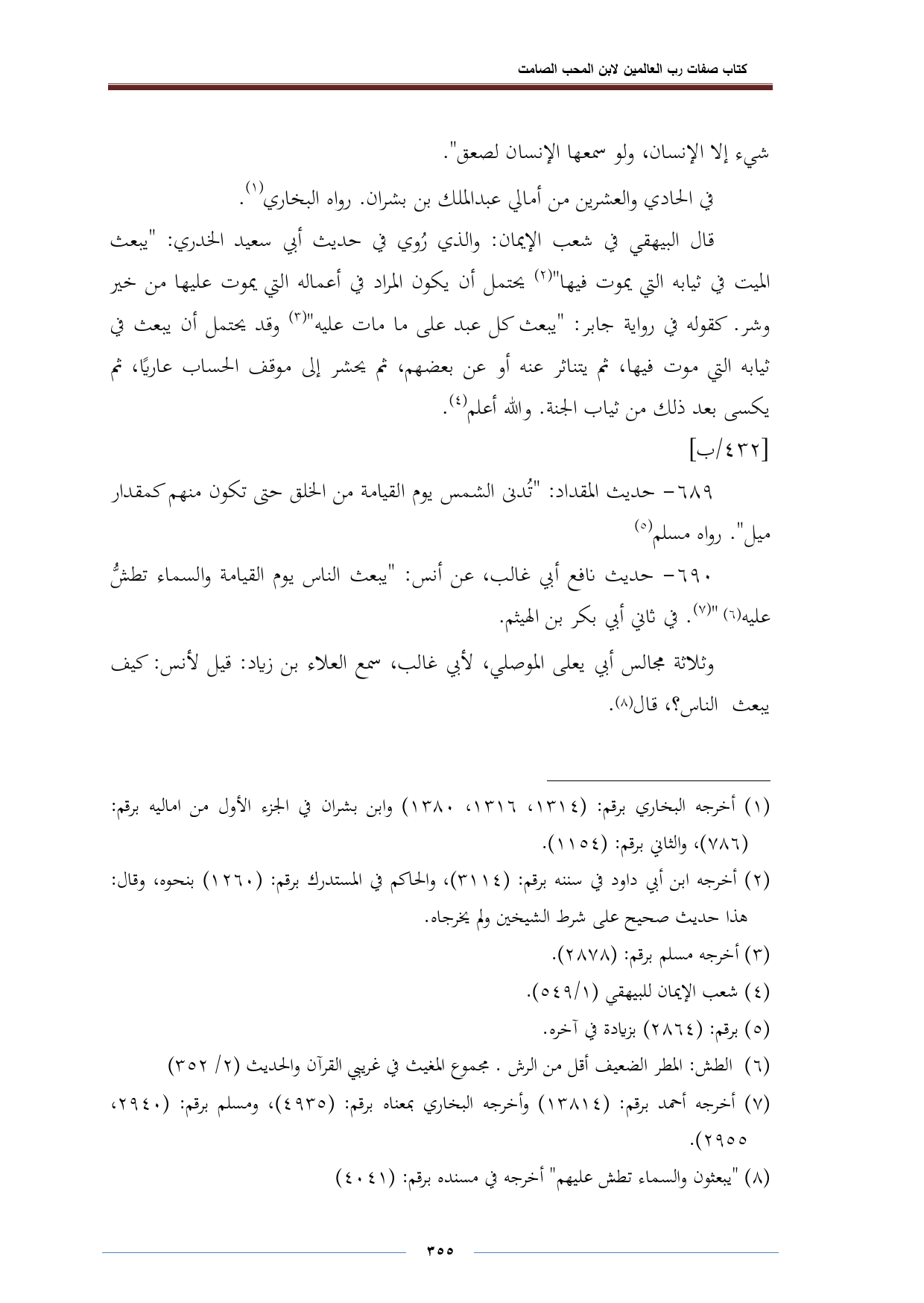 قال البيهقي في شعب الإيمان: والذي رُوي في حديث أبي سعيد الخدري: "يبعث الميت في ثيابه التي يموت فيها" (¬٢) يحتمل أن يكون المراد في أعماله التي يموت عليها من خير وشر. كقوله في رواية جابر: "يبعث كل عبد على ما مات عليه" (¬٣) وقد يحتمل أن يبعث في ثيابه التي موت فيها، ثم يتناثر عنه أو عن بعضهم، ثم يحشر إلى موقف الحساب عاريًا، ثم يكسى بعد ذلك من ثياب الجنة. والله أعلم (¬٤).