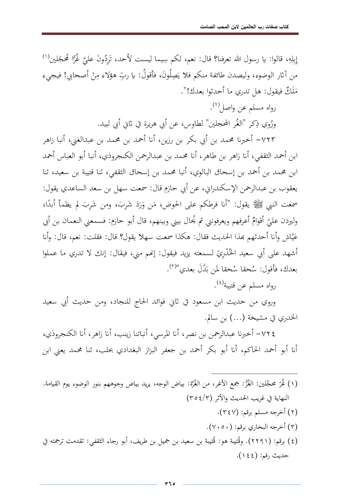 ٧٢٣ - أخبرنا محمد بن أبي بكر بن رزين، أنا أحمد بن محمد بن عبد الغني، أنبا زاهر ابن أحمد الثقفي، أنا زاهر بن طاهر، أنا محمد بن عبد الرحمن الكنجروذي، أنبا أبو العباس أحمد ابن محمد بن أحمد بن إسحاق البالوي، أنبا محمد بن إسحاق الثقفي، ثنا قتيبة بن سعيد، ثنا يعقوب بن عبد الرحمن الإسكندراني، عن أبي حازم قال: سمعت سهل بن سعد الساعدي يقول: سمعت النبي - صلى الله عليه وسلم - يقول: "أنا فرطكم على الحوض، مَن وَرَدَ شَرِبَ، ومن شَرِبَ لم يظمأ أبدًا، وليردن عليِّ أقوامٌ أعرفهم ويعرفونني ثم يُحال بيني وبينهم، قال أبو حازم: فسمعني النعمان بن أبي عَيَّاش وأنا أحدثهم بهذا الحديث فقال: هكذا سمعت سهلا يقول؟ قال: فقلت: نعم، قال: وأنا أشهد على أبي سعيد الخُدْرِيّ لسمعته يزيد فيقول: إنهم مني، فيقال: إنك لا تدري ما عملوا بعدك، فأقول: سُحقا سُحقا لمن بَدَّلَ بعدي" (¬٣).