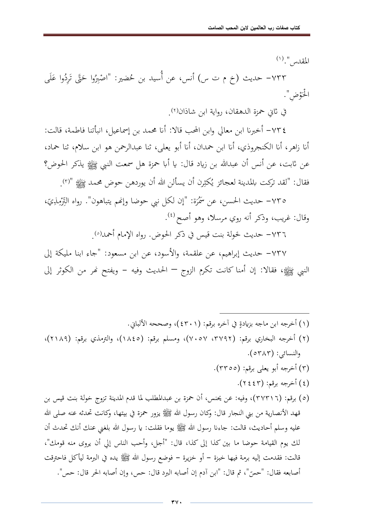 ٧٣٣ - حديث (خ م ت س) أنس، عن أُسيد بن حُضير: "اصْبرُوا حَتَّى تَرِدُوا عَلَى الحَوْضِ".