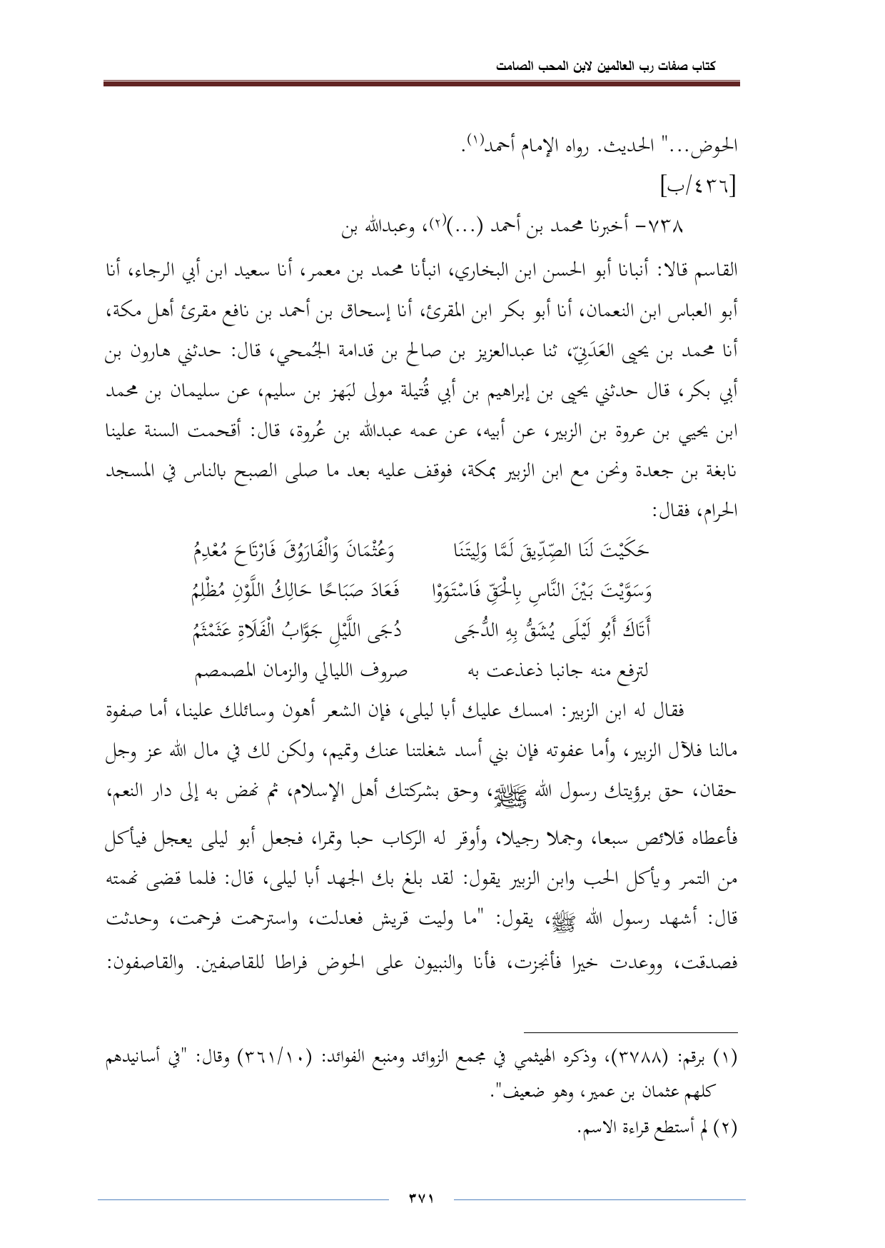 القاسم قالا: أنبأنا أبو الحسن ابن البخاري، أنبأنا محمد بن معمر، أنا سعيد ابن أبي الرجاء، أنا أبو العباس ابن النعمان، أنا أبو بكر ابن المقرئ، أنا إسحاق بن أحمد بن نافع مقرئ أهل مكة، أنا محمد بن يحيى العَدَنِيّ، ثنا عبد العزيز بن صالح بن قدامة الجُمحي، قال: حدثني هارون بن أبي بكر، قال حدثني يحيى بن إبراهيم بن أبي قُتيلة مولى لبَهز بن سليم، عن سليمان بن محمد ابن يحيي بن عروة بن الزبير، عن أبيه، عن عمه عبد الله بن عُروة، قال: أقحمت السنة علينا نابغة بن جعدة ونحن مع ابن الزبير بمكة، فوقف عليه بعد ما صلى الصبح بالناس في المسجد الحرام، فقال: