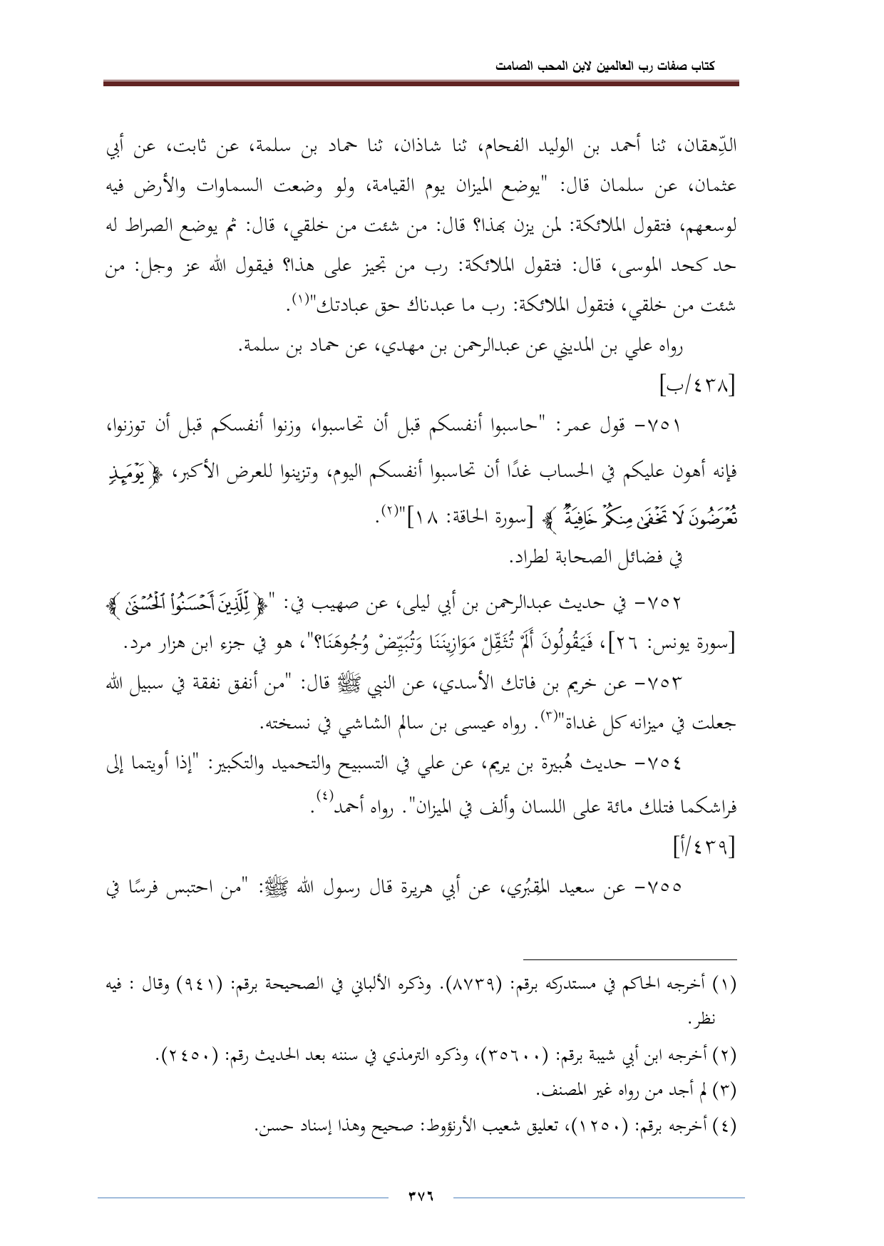 الدِّهقان، ثنا أحمد بن الوليد الفحام، ثنا شاذان، ثنا حماد بن سلمة، عن ثابت، عن أبي عثمان، عن سلمان قال: "يوضع الميزان يوم القيامة، ولو وضعت السماوات والأرض فيه لوسعهم، فتقول الملائكة: لمن يزن بهذا؟ قال: من شئت من خلقي، قال: تم يوضع الصراط له حد كحد الموسى، قال: فتقول الملائكة: رب من تجيز على هذا؟ فيقول الله عز وجل: من شئت من خلقي، فتقول الملائكة: رب ما عبدناك حق عبادتك" (¬١).
