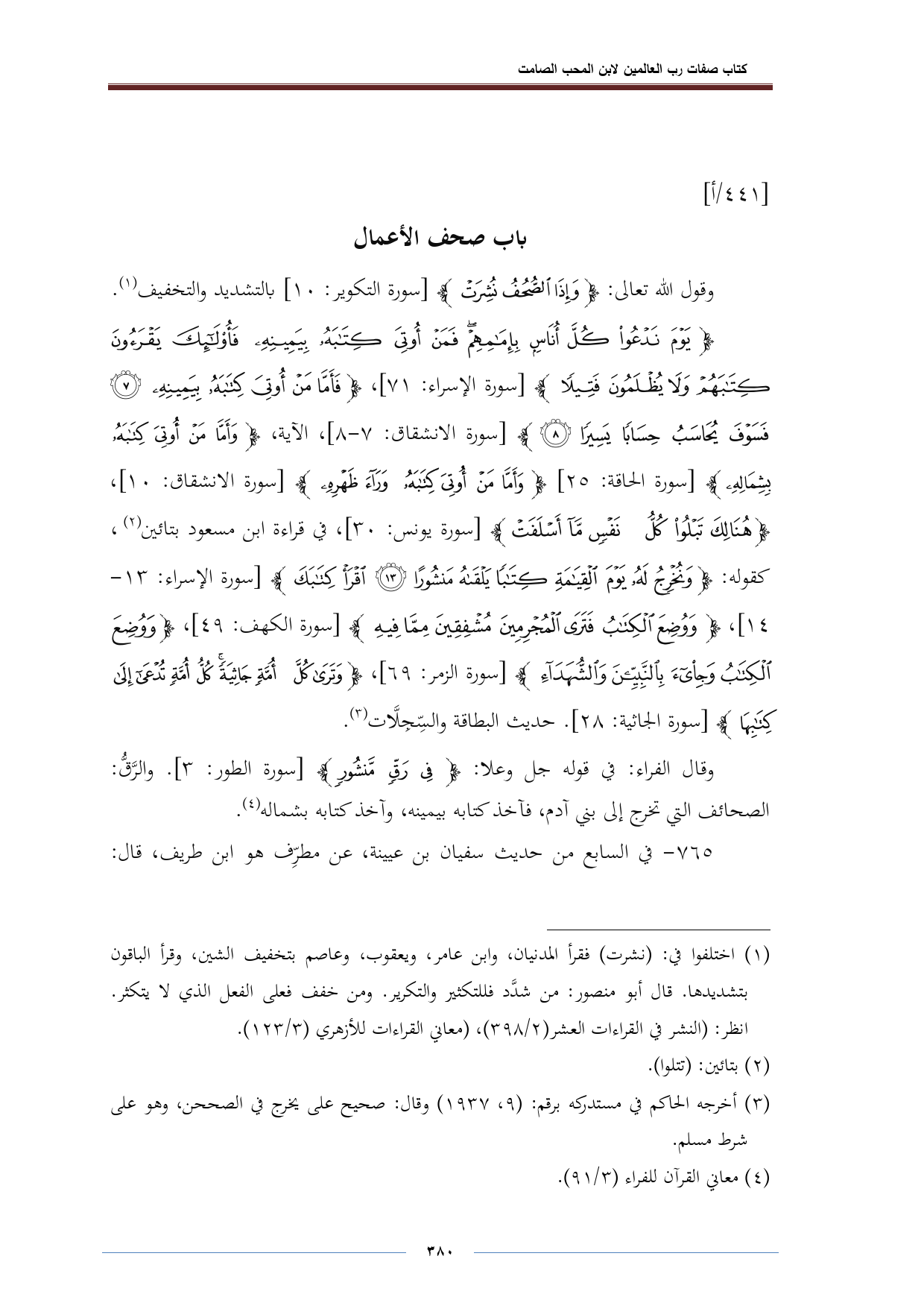 {يَوْمَ نَدْعُو كُلَّ أُنَاسٍ بِإِمَامِهِمْ فَمَنْ أُوتِيَ كِتَابَهُ بِيَمِينِهِ فَأُولَئِكَ يَقْرَءُونَ كِتَابَهُمْ وَلَا يُظْلَمُونَ فَتِيلًا} [سورة الإسراء: ٧١]، {فَأَمَّا مَنْ أُوتِيَ كِتَابَهُ بِيَمِينِهِ (٧) فَسَوْفَ يُحَاسَبُ حِسَابًا يَسِيرًا (٨)} [سورة الانشقاق: ٧ - ٨]، الآية، {وَأَمَّا مَنْ أُوتِيَ كِتَابَهُ بِشِمَالِهِ} [سورة الحاقة: ٢٥] {وَأَمَّا مَنْ أُوتِيَ كِتَابَهُ وَرَاءَ ظَهْرِهِ} [سورة الانشقاق: ١٠]، {هُنَالِكَ تَبْلُو كُلُّ نَفْسٍ مَا أَسْلَفَتْ} [سورة يونس: ٣٠]، في قراءة ابن مسعود بتائين (¬٢)، كقوله: {وَنُخْرِجُ لَهُ يَوْمَ الْقِيَامَةِ كِتَابًا يَلْقَاهُ مَنْشُورًا (١٣) اقْرَأْ كِتَابَكَ} [سورة الإسراء: ١٣ - ١٤]، {وَوُضِعَ الْكِتَابُ فَتَرَى الْمُجْرِمِينَ مُشْفِقِينَ مِمَّا فِيهِ} [سورة الكهف: ٤٩]، {وَوُضِعَ الْكِتَابُ وَجِيءَ بِالنَّبِيِّينَ وَالشُّهَدَاءِ} [سورة الزمر: ٦٩]، {وَتَرَى كُلَّ أُمَّةٍ جَاثِيَةً كُلُّ أُمَّةٍ تُدْعَى إِلَى كِتَابِهَا} [سورة الجاثية: ٢٨]. حديث البطاقة والسِّجِلِّات (¬٣).