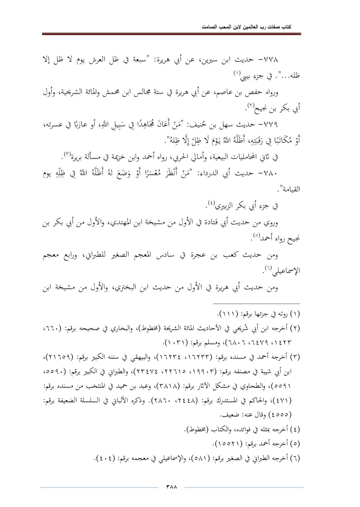 ٧٧٨ - حديث ابن سيرين، عن أبي هريرة: "سبعة في ظل العرش يوم لا ظل إلا ظله ... ". في جزء بيبى (¬١)