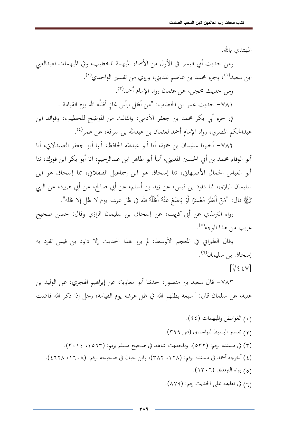٧٨٢ - أخبرنا سليمان بن حمزة، أنا أبو عبد الله الحافظ، أنبا أبو جعفر الصيدلاني، أنا أبو الوفاء محمد بن أبي الحسين المديني، أنبأ أبو طاهر ابن عبد الرحيم، انا أبو بكر ابن فورك، ثنا أبو العباس الجمال الأصبهاني، ثنا إسحاق هو ابن إسماعيل الفلفلاني، ثنا إسحاق هو ابن سليمان الرازي، ثنا داود بن قيس، عن زيد بن أسلم، عن أبي صالح، عن أبي هريرة، عن النبي - صلى الله عليه وسلم - قال: "مَنْ أَنْظَرَ مُعْسَرًا أَوْ وَضَعَ عَنْهُ أَظَلَّهُ الله في ظل عرشه يوم لا ظل إلا ظله".