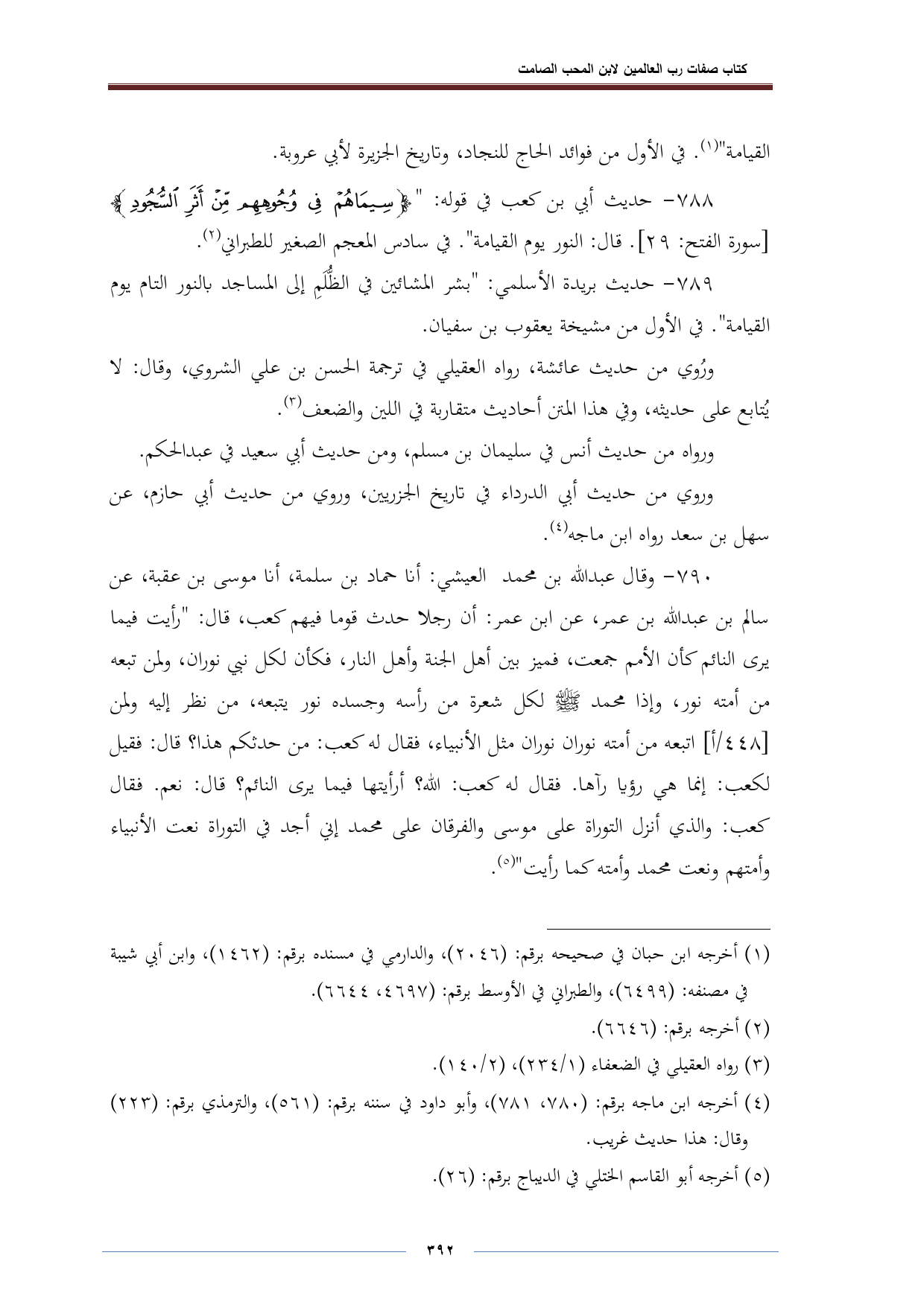 ٧٨٨ - حديث أبي بن كعب في قوله: {سِيمَاهُمْ فِي وُجُوهِهِمْ مِنْ أَثَرِ السُّجُودِ} [سورة الفتح: ٢٩]. قال: النور يوم القيامة". في سادس المعجم الصغير للطبراني (¬٢).