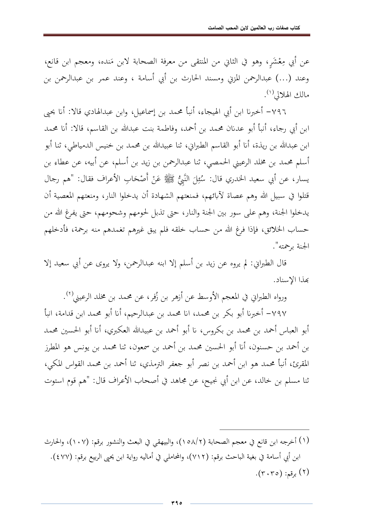 ٧٩٦ - أخبرنا ابن أبي الهيجاء، أنبأ محمد بن إسماعيل، وابن عبد الهادي قالا: أنا يحيى ابن أبي رجاء، أنبأ أبو عدنان محمد بن أحمد، وفاطمة بنت عبد الله بن القاسم، قالا: أنا محمد ابن عبد الله بن ريذة، أنا أبو القاسم الطبراني، ثنا عبيد الله بن محمد بن خنيس الدمياطي، ثنا أبو أسلم محمد بن مخلد الرعيني الحمصي، ثنا عبد الرحمن بن زيد بن أسلم، عن أبيه، عن عطاء بن يسار، عن أبي سعيد الخدري قال: سُئِلَ النَّبِيُّ - صلى الله عليه وسلم - عَنْ أَصْحَابِ الأعراف فقال: "هم رجال قتلوا في سبيل الله وهم عصاة لآبائهم، فمنعتهم الشهادة أن يدخلوا النار، ومنعتهم المعصية أن يدخلوا الجنة، وهم على سور بين الجنة والنار، حتى تذبل لحومهم وشحومهم، حى يفرغ الله من حساب الخلائق، فإذا فرغ الله من حساب خلقه فلم يبق غيرهم تغمدهم منه برحمة، فأدخلهم الجنة برحمته".
