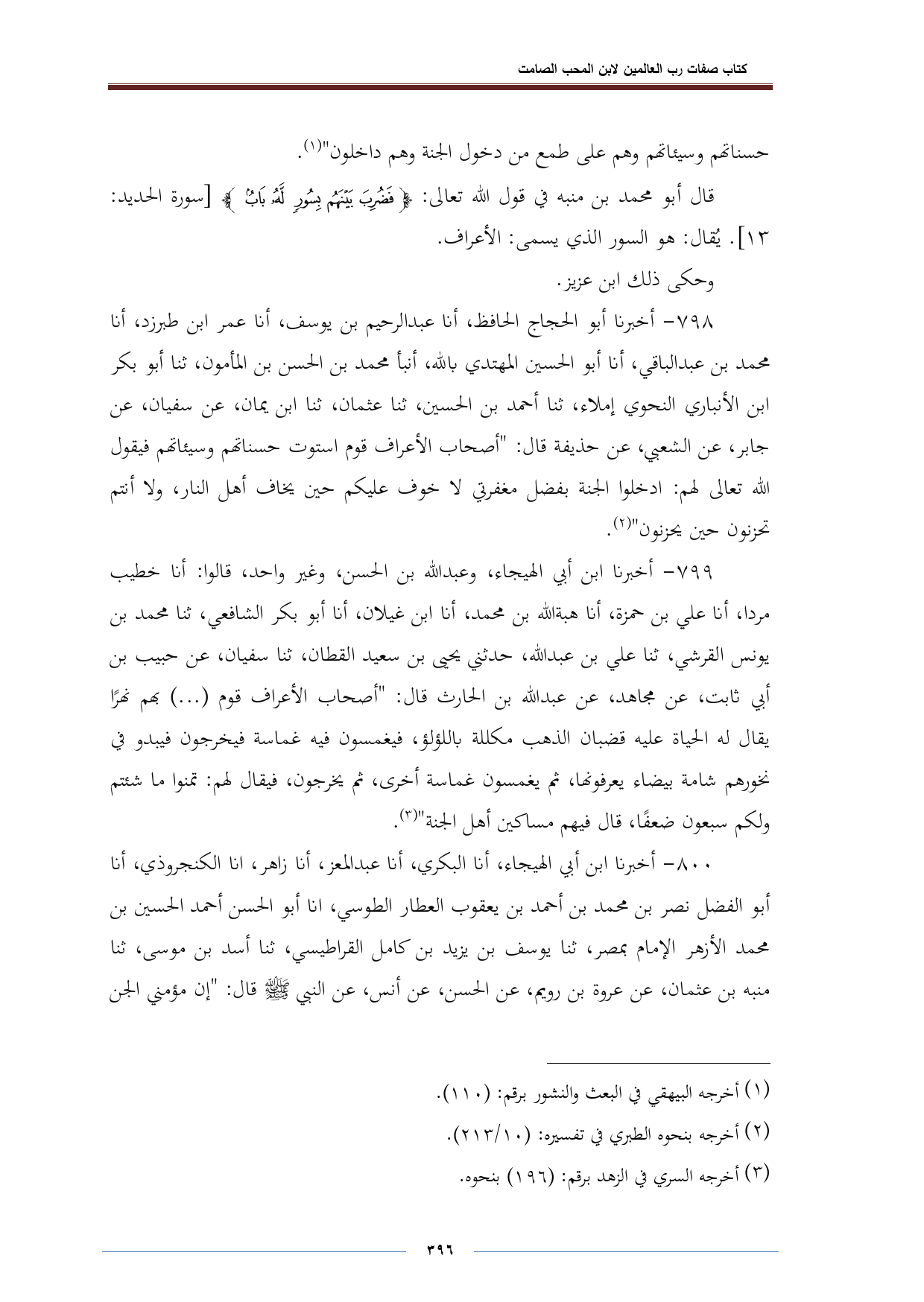 ٧٩٩ - أخبرنا ابن أبي الهيجاء، وعبد الله بن الحسن، وغير واحد، قالوا: أنا خطيب مردا، أنا علي بن حمزة، أنا هبة الله بن محمد، أنا ابن غيلان، أنا أبو بكر الشافعي، ثنا محمد بن يونس القرشي، ثنا علي بن عبد الله، حدثني يحيى بن سعيد القطان، ثنا سفيان، عن حبيب بن أبي ثابت، عن مجاهد، عن عبد الله بن الحارث قال: "أصحاب الأعراف قوم ( ... ) بهم نهرًا يقال له الحياة عليه قضبان الذهب مكللة باللؤلؤ، فيغمسون فيه غماسة فيخرجون فيبدو في نخورهم شامة بيضاء يعرفونها، تم يغسون غماسة أخرى، ثم يخرجون، فيقال لهم: تمنوا ما شئتم ولكم سبعون ضعفًا، قال فيهم مساكين أهل الجنة" (¬٣).