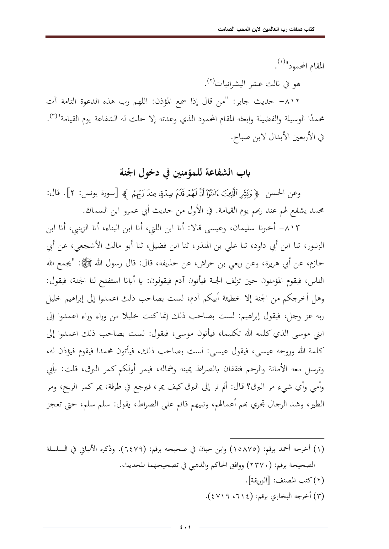٨١٢ - حديث جابر: "من قال إذا سمع المؤذن: اللهم رب هذه الدعوة التامة آت محمدًا الوسيلة والفضيلة وابعثه المقام المحمود الذي وعدته إلا حلت له الشفاعة يوم القيامة" (¬٣). في الأربعين الأبدال لابن صباح.