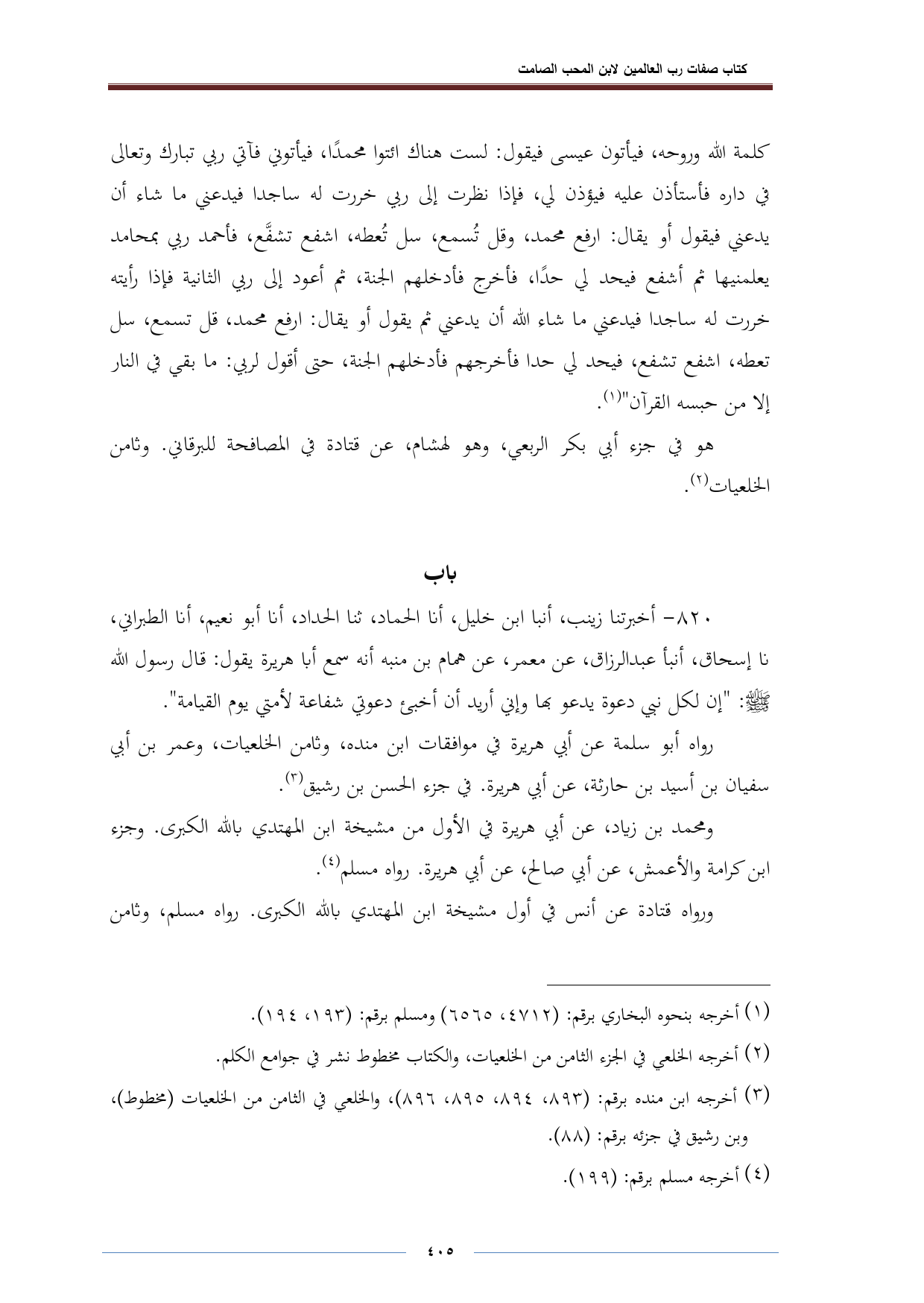 ٨٢٠ - أخبرتنا زينب، أنبا ابن خليل، أنا الحماد، ثنا الحداد، أنا أبو نعيم، أنا الطبراني، نا إسحاق، أنبأ عبد الرزاق، عن معمر، عن همام بن منبه أنه سمع أبا هريرة يقول: قال رسول الله -صلى الله عليه وسلم-: "إن لكل نبي دعوة يدعو بها وإني أريد أن أخبئ دعوتي شفاعة لأمتي يوم القيامة".