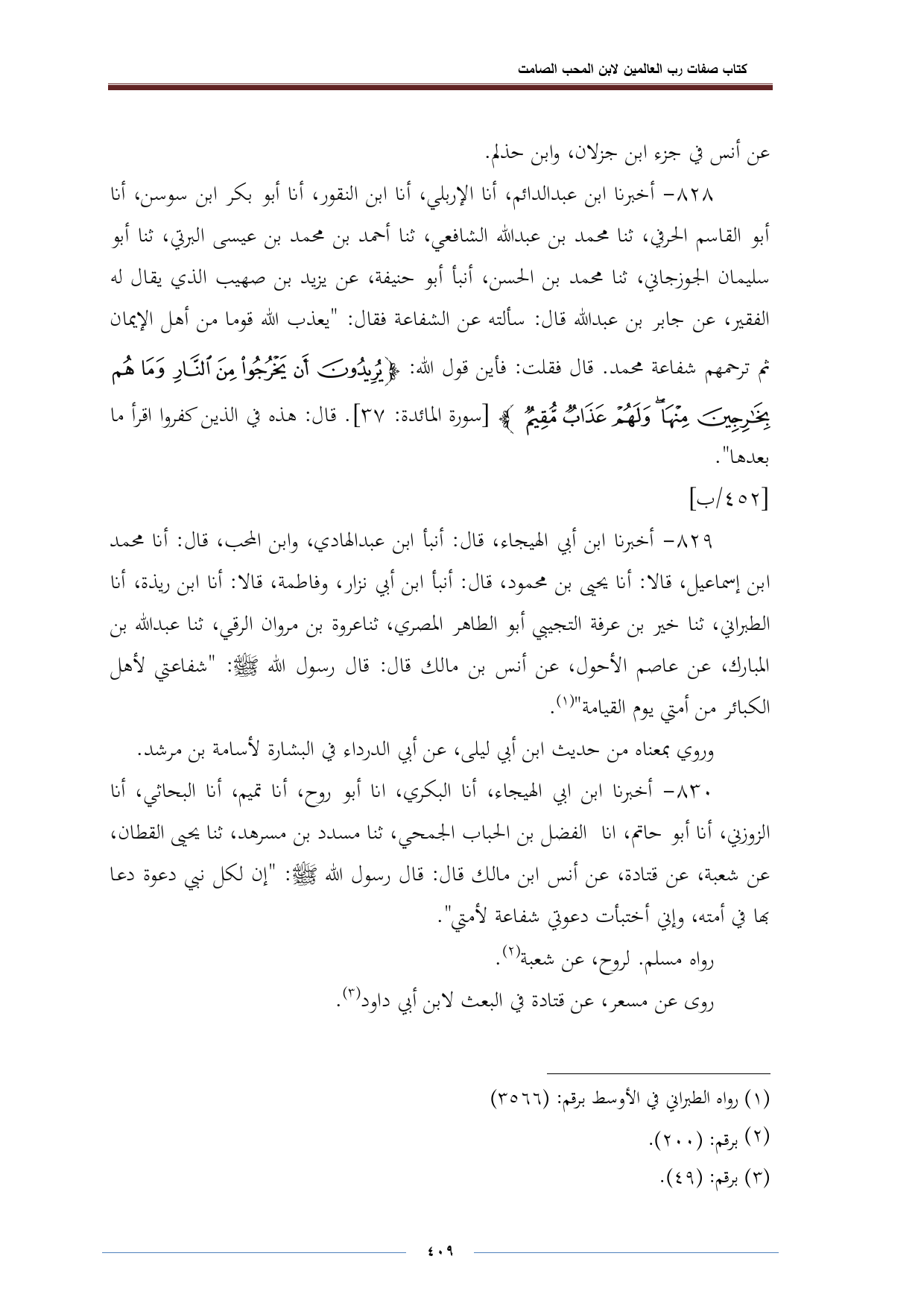 ٨٢٩ - أخبرنا ابن أبي الهيجاء، قال: أنبأ ابن عبد الهادي، وابن المحب، قال: أنا محمد ابن إسماعيل، قالا: أنا يحيى بن محمود، قال: أنبأ ابن أبي نزار، وفاطمة، قالا: أنا ابن ريذة، أنا الطبراني، ثنا خير بن عرفة التجيي أبو الطاهر المصري، ثنا عروة بن مروان الرقي، ثنا عبد الله بن المبارك، عن عاصم الأحول، عن أنس بن مالك قال: قال رسول الله -صلى الله عليه وسلم-: "شفاعتي لأهل الكبائر من أمتي يوم القيامة" (¬١).